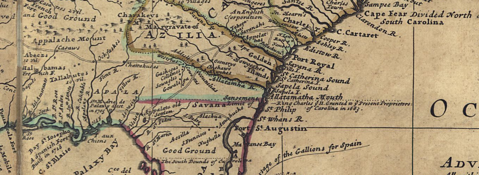 About the featured image: A 1732 map of American territories claimed by France, England, and Spain. It lists several Timucua towns.