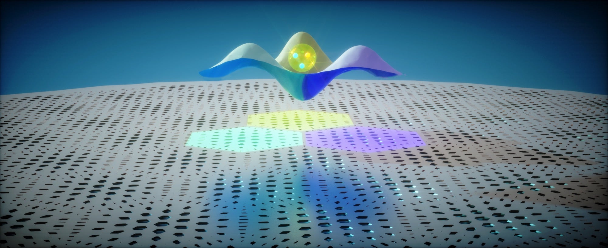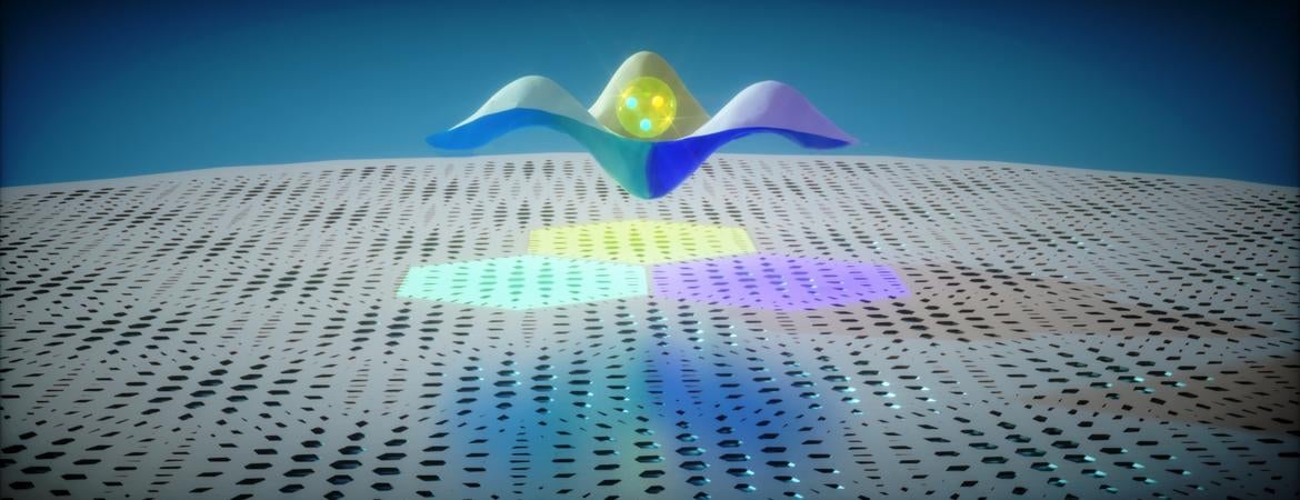 Header image caption: A trion trapped in a moiré potential well. The plane represents the moiré superlattice with a simplified moiré pattern. Three moiré cells are highlighted in color. Above them is the potential energy profile. The sphere with three glowing "balls" represents the moiré trion. Credit: Ella Maru Studio, with contributions from Hongyi Yu and Wang Yao at the University of Hong Kong; and Wangxiang Li and Joshua Lui at UC Riverside.