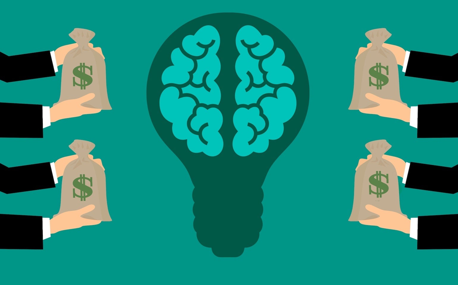 An image showing hands giving money to a brain inside a lightbulb, representing the idea of crowdfunding