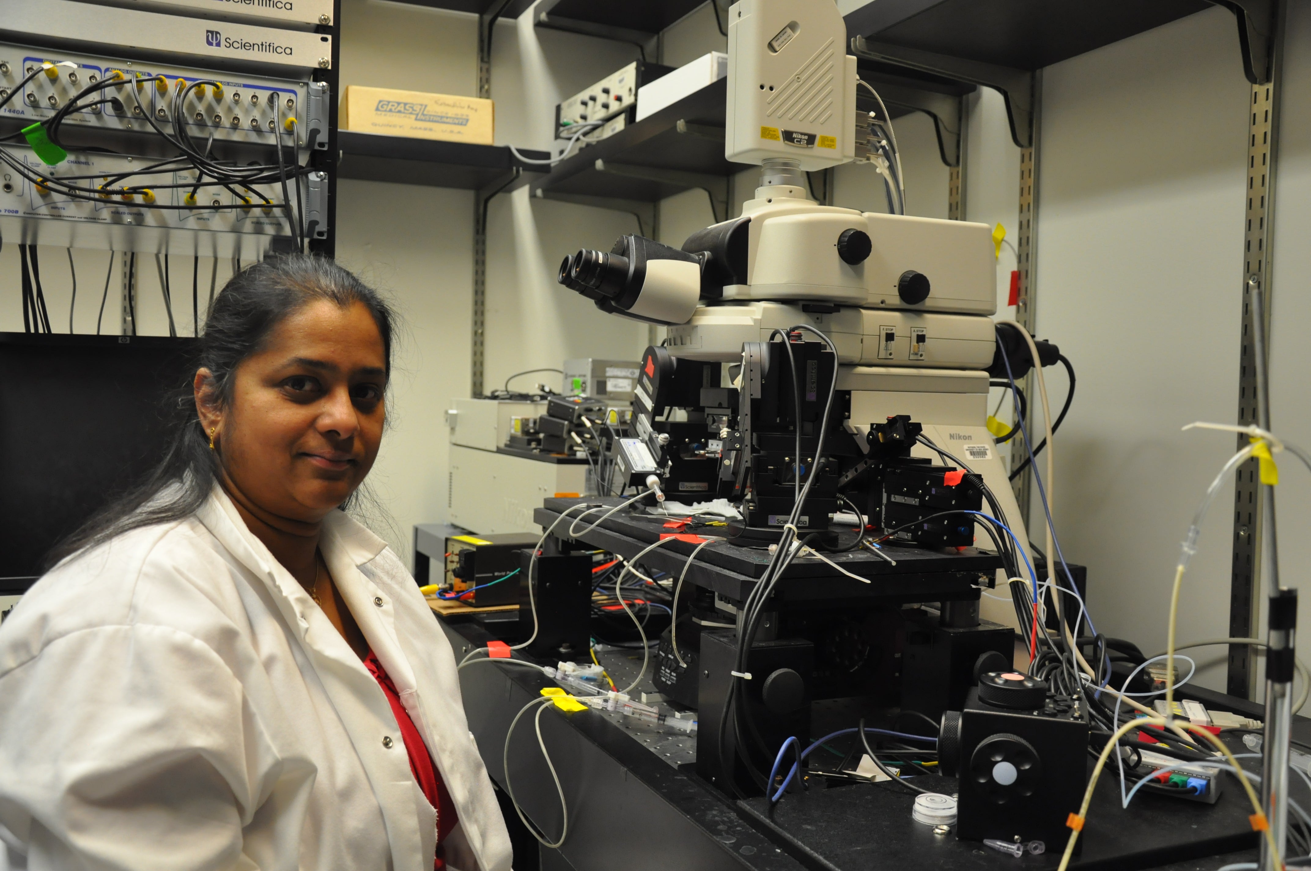 Header image shows Viji Santhakumar in her lab.
