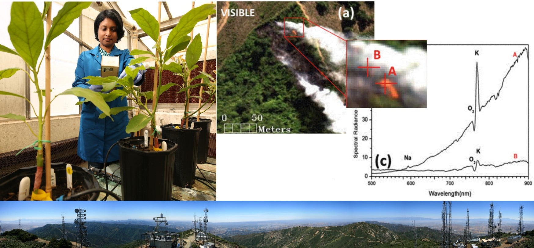 Header photo: Clockwise from top left: UC Riverside's technological living laboratories for addressing food insecurities (image credit: UCR/Stan Lim). VNIR (visible and near infrared) detection of flame beneath smoke (image credit: UCI/Glenn Healey). Panorama from the networking hub atop Santiago Peak that connects UC San Diego, UC Irvine and UC Riverside (image credit: HPWren).