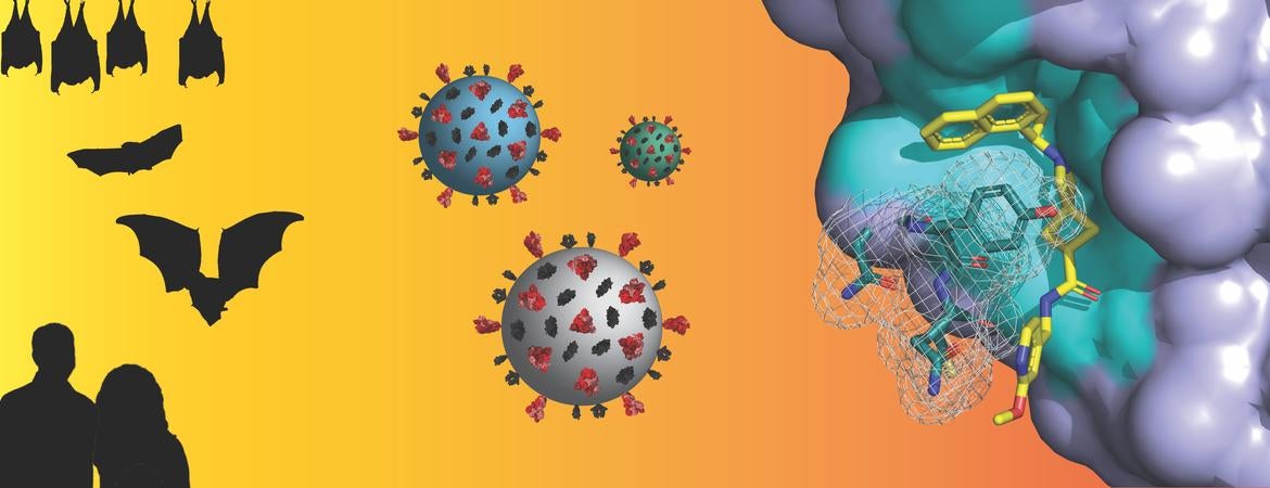 Header image credit: Pegan lab, UC Riverside. Image can also be found below. Image shows, from left to right, bats and humans; coronaviruses; and an X-ray atomic level structure of DC37, a drug-like small molecule, binding to a SARS-like coronavirus protein drug target.