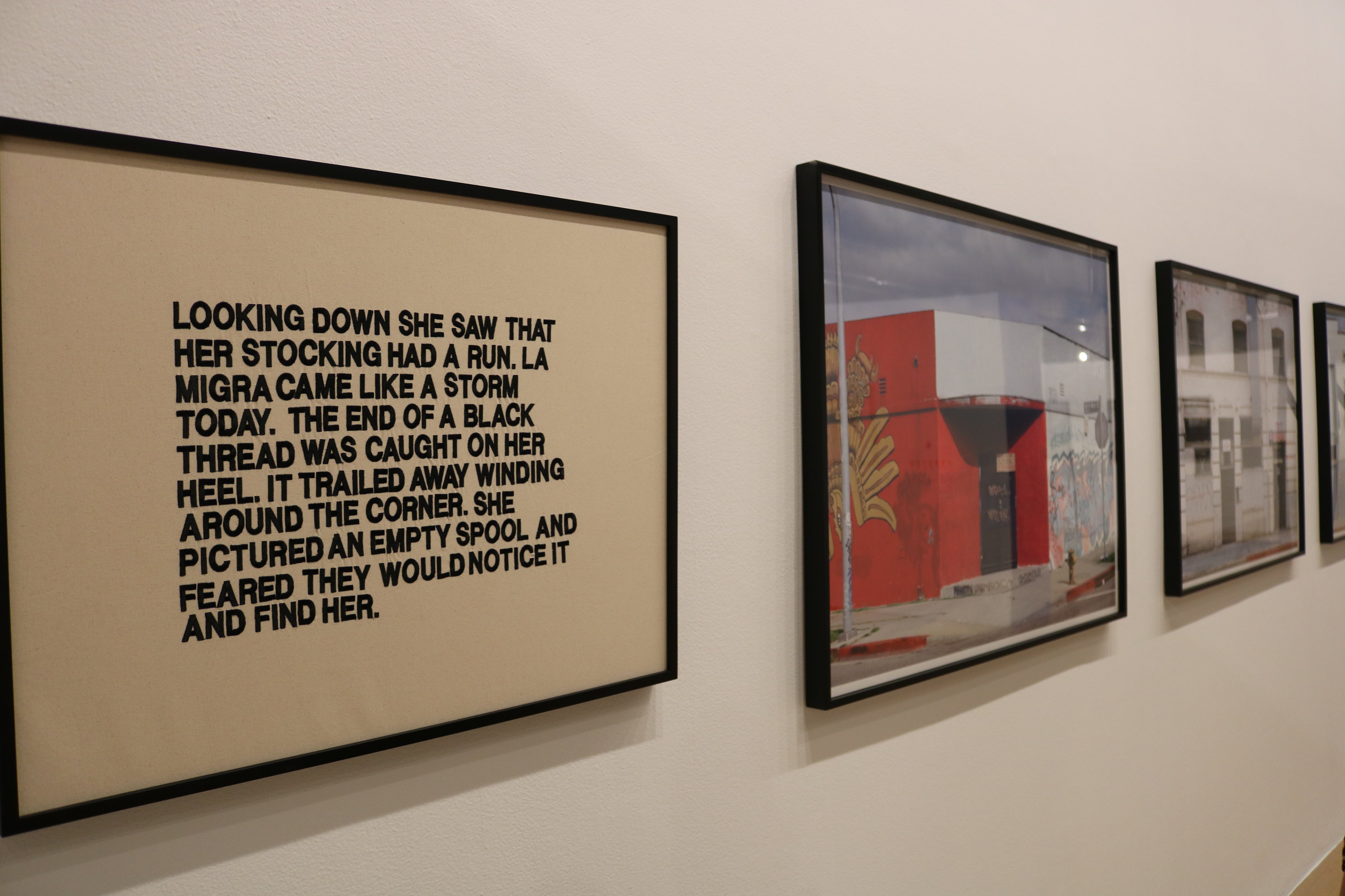 One of the photos series, “Manuela S-T-I-T-C-H-E-D” speaks to the workers in LA’s garment district. The images show no faces, just buildings that appear empty. But handwritten cardboard signs taped to windows indicate otherwise, seeking someone who can operate a “cover stich” sewing machine, or a worker “para planchar,” to iron.