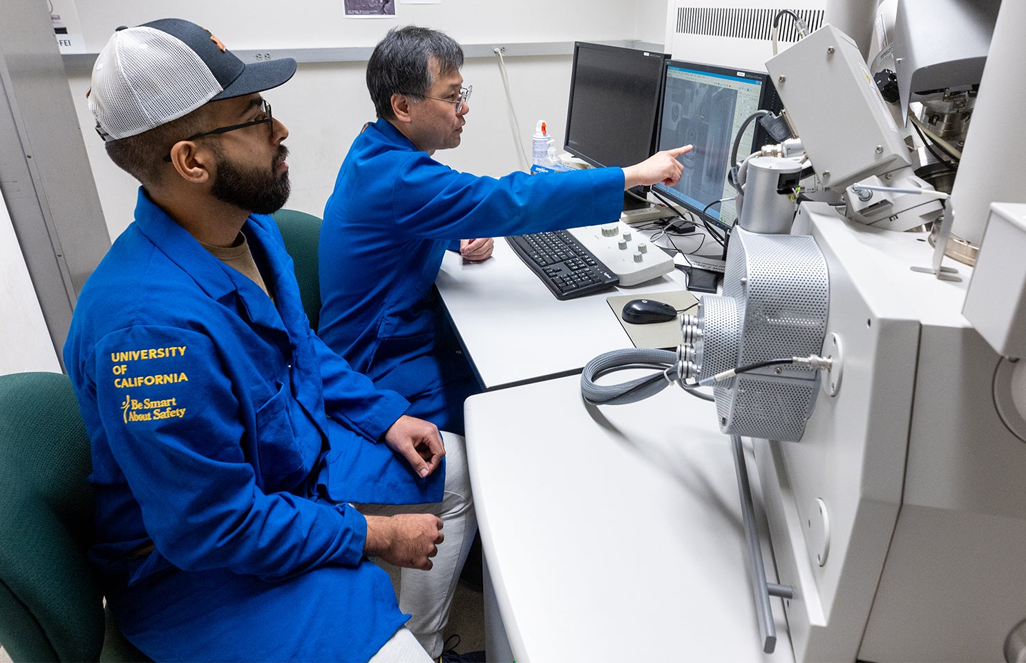 Header photo: Ilkeun Lee shows PhD student Sourabh Ramakkrishna how to operate a scanning electron microscope in the Nanofabrication Facility, at the Bourns College of Engineering, on March 19, 2024. (UCR/Stan Lim)