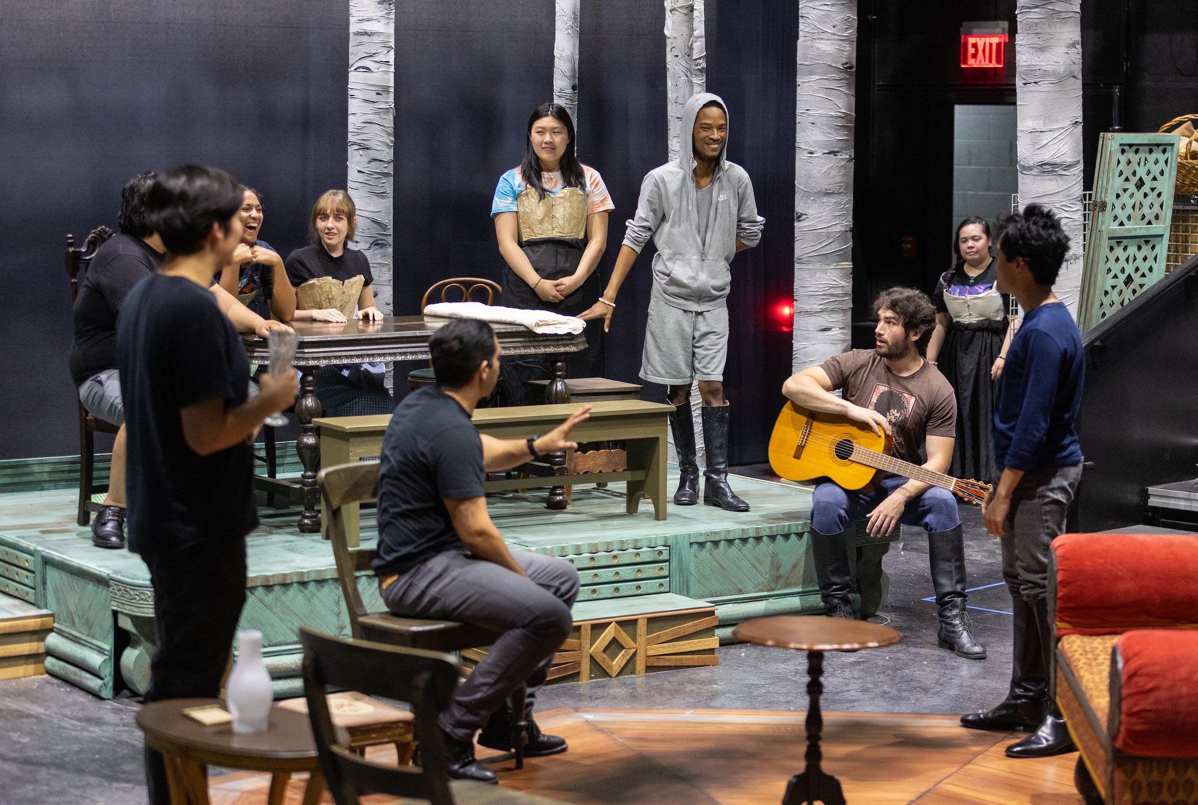 The interactions, whether the nuanced reactions between characters or the larger choreography of marching soldiers, falls under the careful eye of director Merlin. Merlin has over 25 years working in theater, film, television, and radio and is an author and college professor of directing and acting. She is grounded in the Stanislavsky method of acting where the actors walk onto the stage as if in the continuum of the character’s life while focusing on the character’s psychological state, reacting to the others on stage realistically as if living in the unfolding moment of lived experience. Coincidently, Chekhov and Stanislavsky were close friends who inspired each other until Chekhov’s untimely death from tuberculosis in 1906.