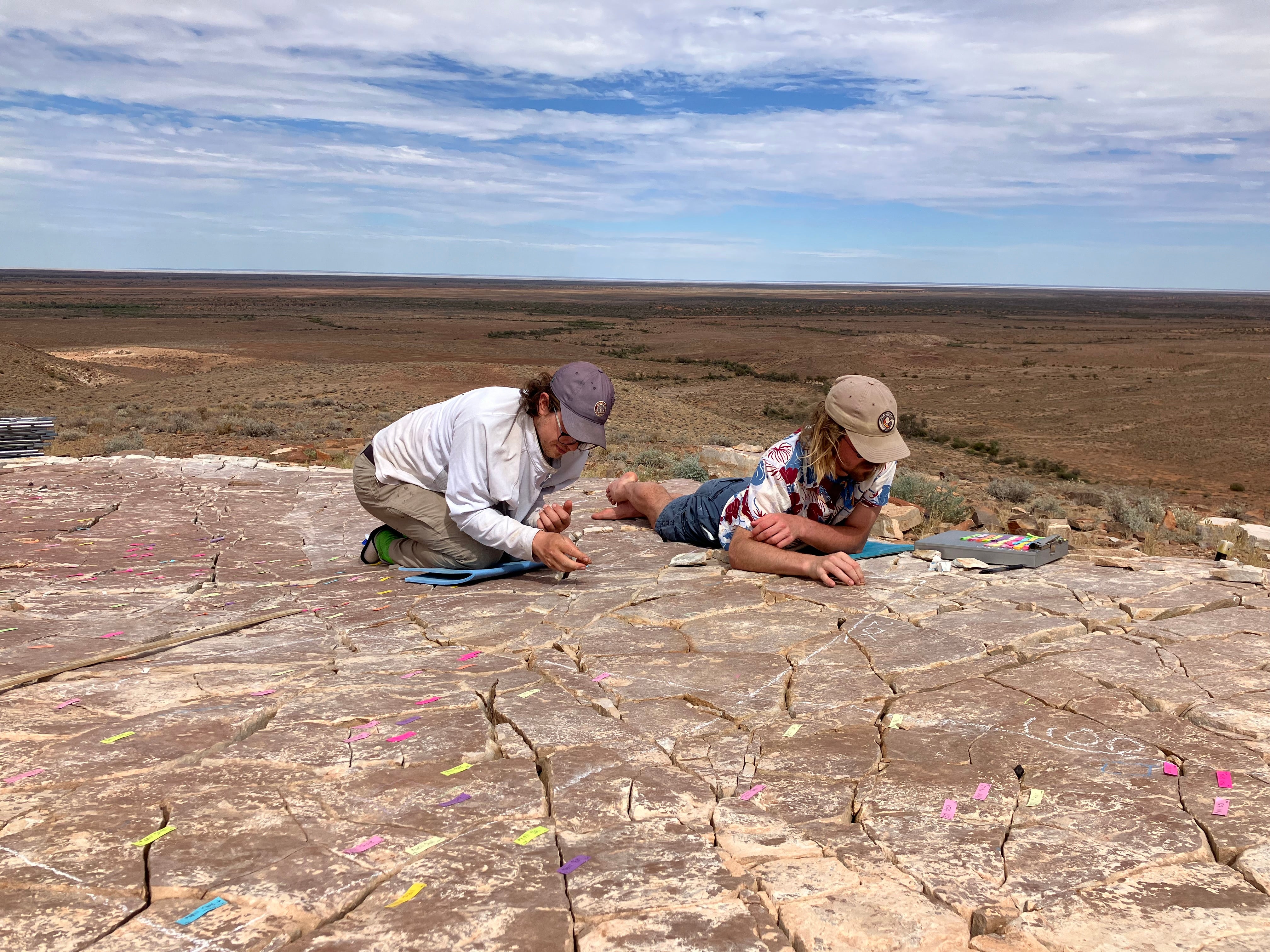 Header photo: Researchers Scott Evans (left) and Ian Hughes examine a fossil bed at Nilpena Ediacara National Park. (Droser Lab/UCR)