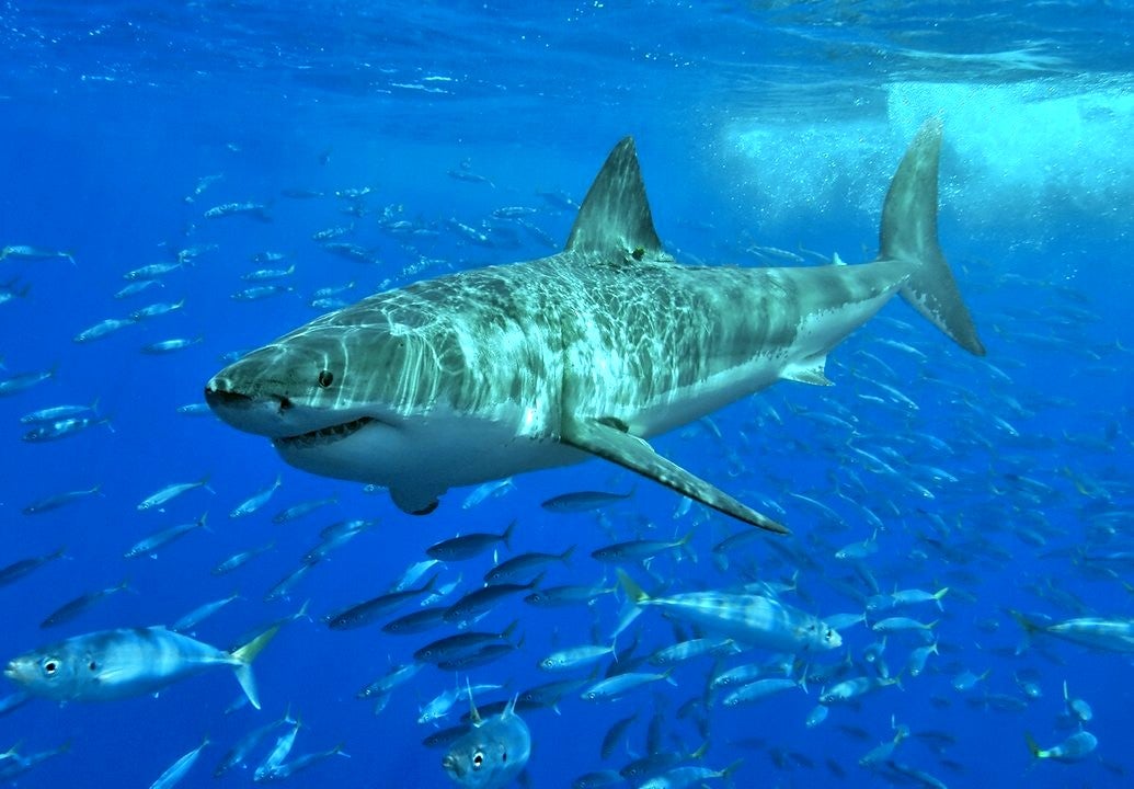 A UCR doctoral student captured for the first time on camera a newborn baby great white shark, shedding its pure white outer layer.