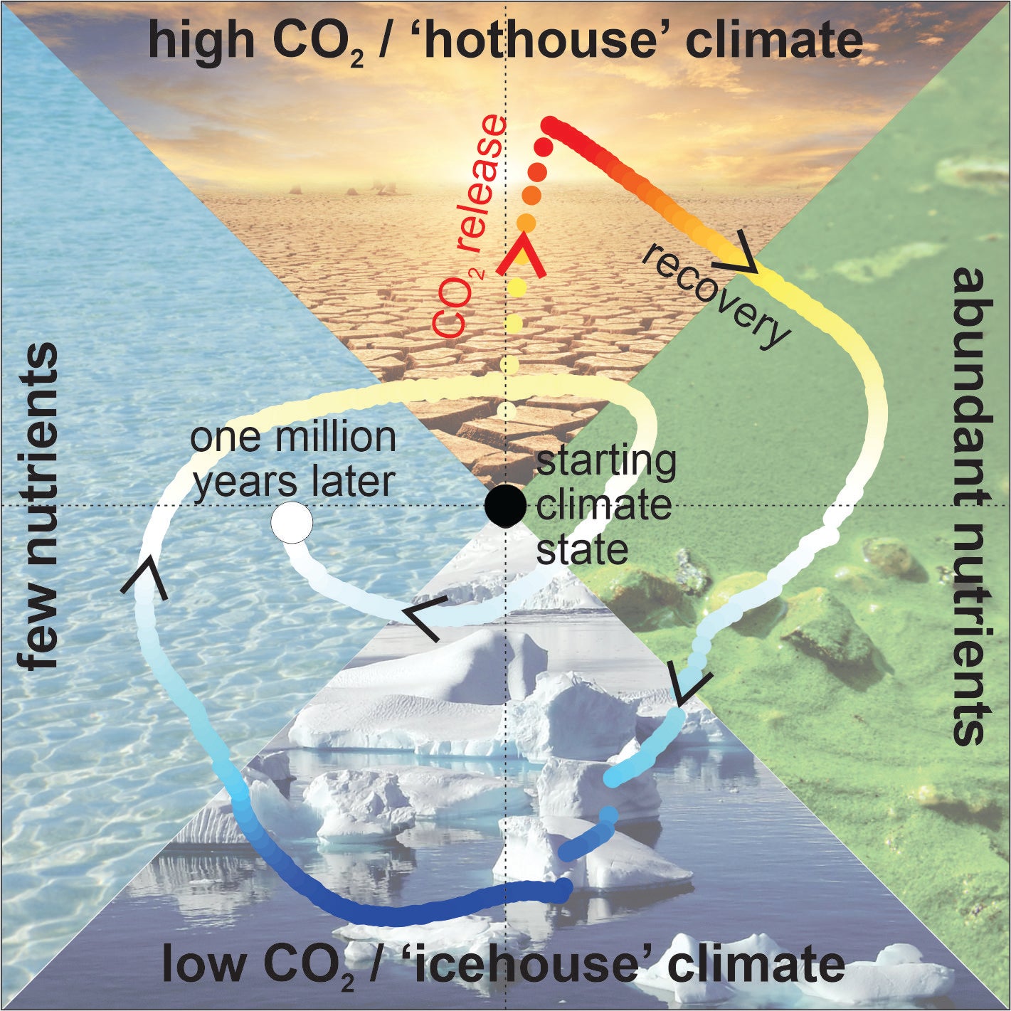 However, in a warmer world with more algal activity, oceans lose oxygen, causing phosphorus to get recycled instead of buried. This creates a feedback loop where more nutrients in the water create more plankton, whose decay removes even more oxygen, and more nutrients get recycled. At the same time, massive amounts of carbon are buried, and the Earth cools.