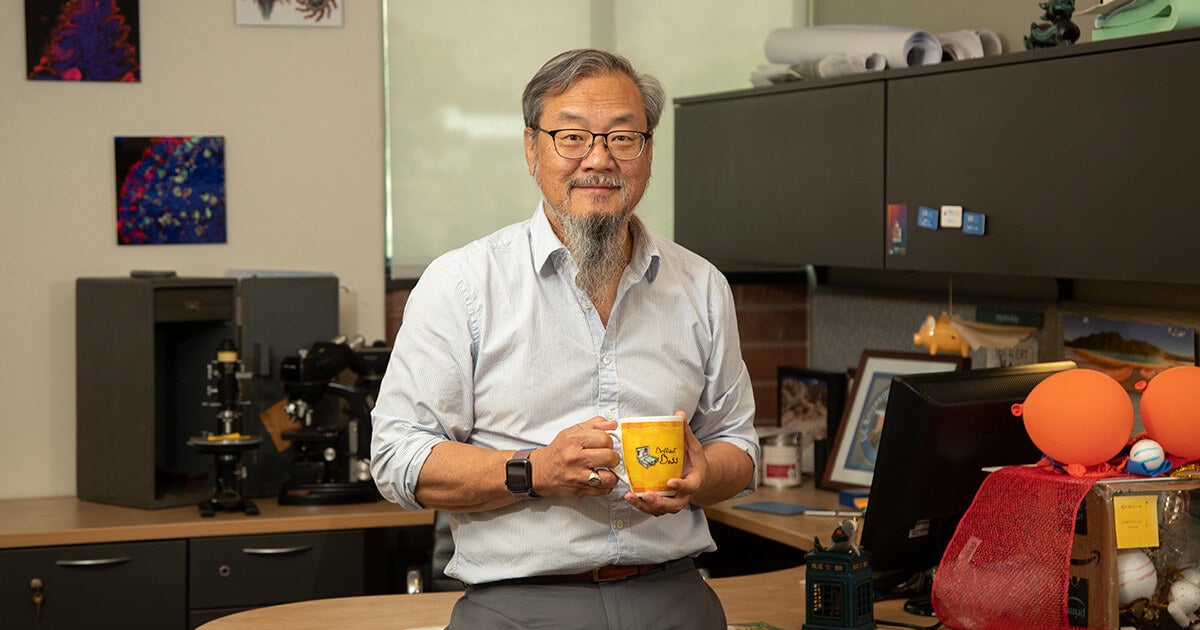 he first thing you might see through the window in Dr. David Lo’s office in the School of Medicine’s Education Building is the giant yellow “C” reclined on Box Springs Mountains in the distance. But then your eye moves swiftly to the interior of his office, to the panoply of objects — microscopes, wall art prints, a model of a flying pig, and a peculiarly shaped ashtray — this distinguished professor of biomedical sciences and senior associate dean for research in the School of Medicine has collected over the years.