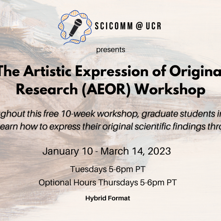 AEOR is a free workshop for graduate students in the sciences to learn how to express their original scientific findings artistically. This workshop will last 10 weeks with each week representing a different art form/medium from an expert artist.