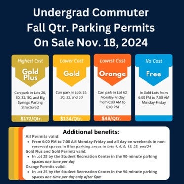 Undergraduate commuter students can purchase their winter quarter parking permits starting at midnight on November 18, 2024. Permits are sold online only through the Parking Portal and can be purchased with a credit card or billed to your Student Business Account. Gold Plus permits (for Big Springs Structure 2) will again be available but are sold at a limited quantity so be sure to go online early.