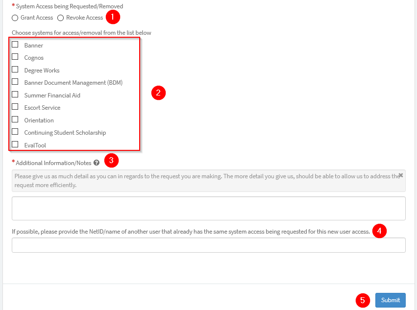 4. Fill out the specific user access requirements. All fields with a red asterisk are required. Enter the following information (numbered on screenshot):