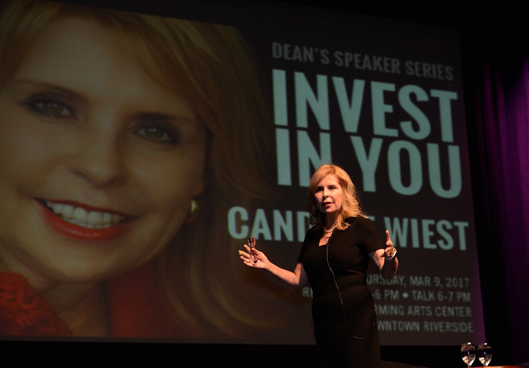 Due to popular demand, the UCR School of Business Dean’s Speaker Series moved downtown to the Fox Performing Arts Center, Riverside, California. Candace Wiest, a 20-year CEO banking executive, spoke to a packed audience of students, faculty, and community members.