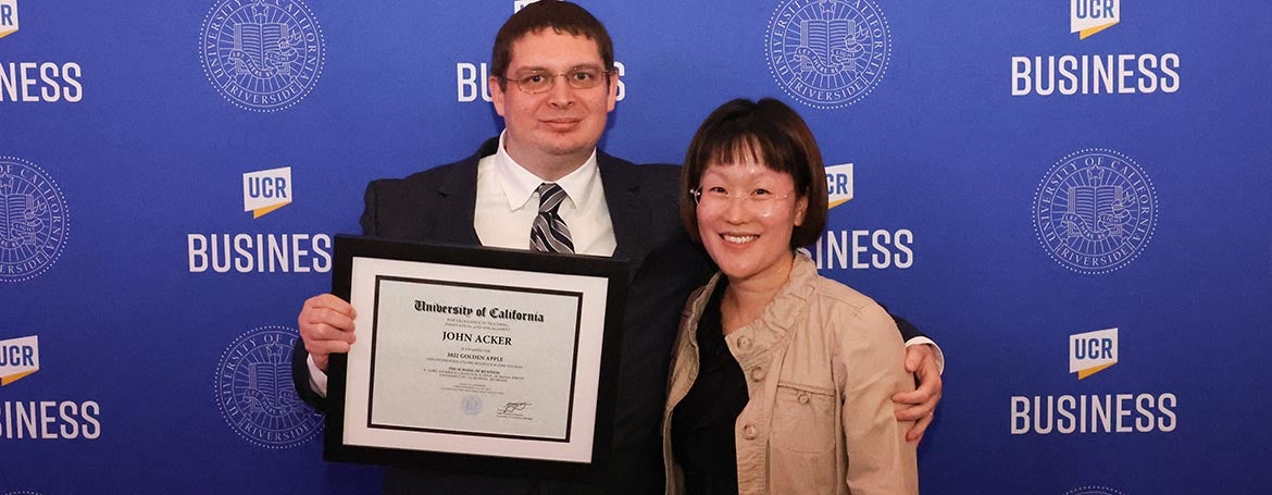 Acker was recently recognized by students, who voted for him to receive the 2021-2022 Golden Apple Award for Teaching Excellence for business administration prerequisite and core courses. This award is given annually to professors who make a profound impact on student learning, both through the clarity of their teaching and the care they show for their students’ success. He was among five professors chosen for the honor in varying categories, and he received a $2,500 prize in recognition of his dedication.