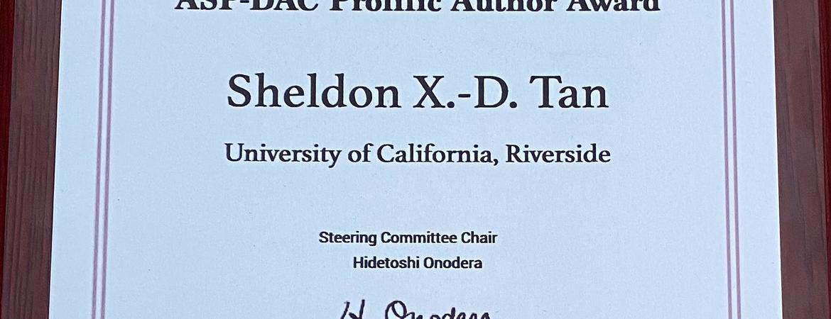 Prof. Sheldon Tan won the ASPDAC Prolific Author Award in the IEEE/ACM Asia and South Pacific Design Automation Conference (ASPDAC) 2020 in Beijing. This award is for authors who have published more 25 papers in ASPDAC. Prof. Tan published 37 papers since 1999, which ranked him as #6 in the prolific author list at  http://aspdac-hall.nics.cc. This award shows the significant contribution and impacts from Prof. Tan's VSCLAB at UCR on ASPDAC and on electronic design automation technique in general.