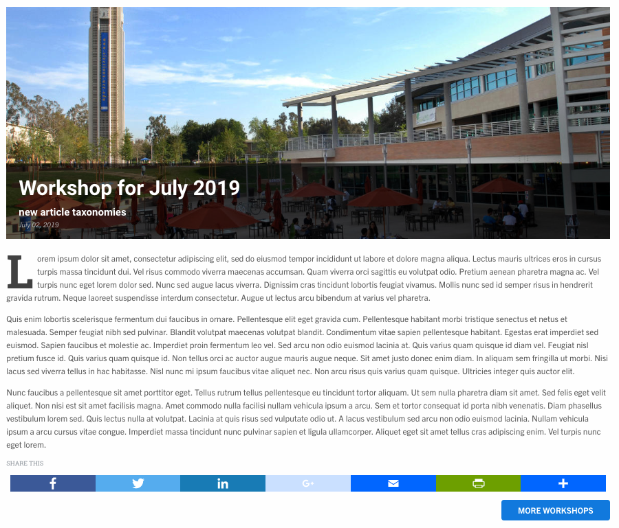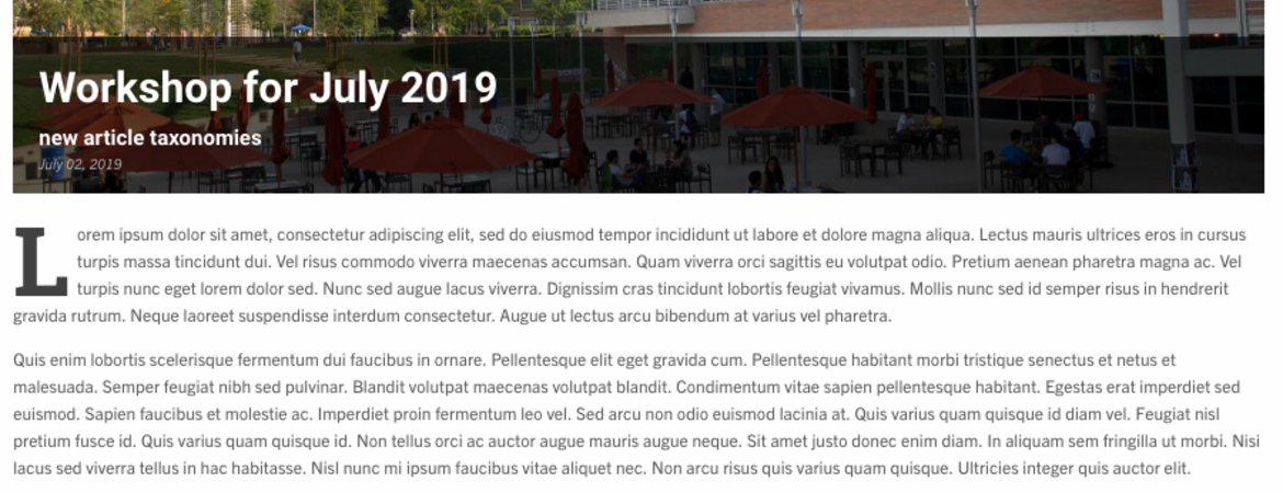 Articles (to be updated on July 5th) are no longer limited to “news”, “press release”, and “blog”. Using the taxonomy vocabulary, “Article Types”, additional article types can be created for a plethora of uses, such as individual blogs. In August, Article Types will be automatically enabled. Before that time, please reach out to Campus Web Solutions to enable permissions.