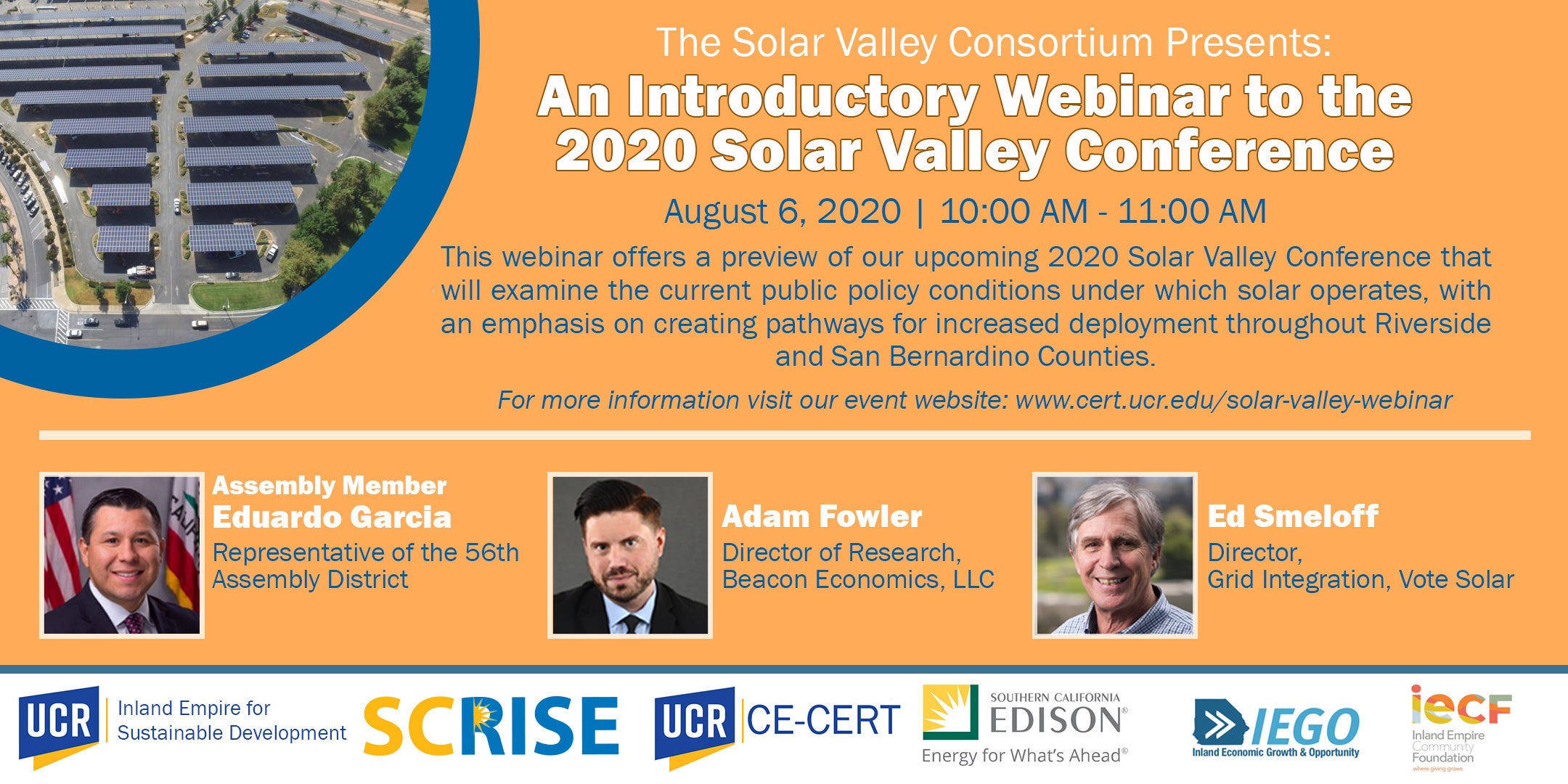 Hosted by Assemblymember Eduardo Garcia, with esteemed panel members Ed Smeloff from Vote Solar, and Adam Fowler from Beacon Economics, this webinar will present a snapshot of legislation and policy initiatives, and solar developments throughout Inland Southern California.