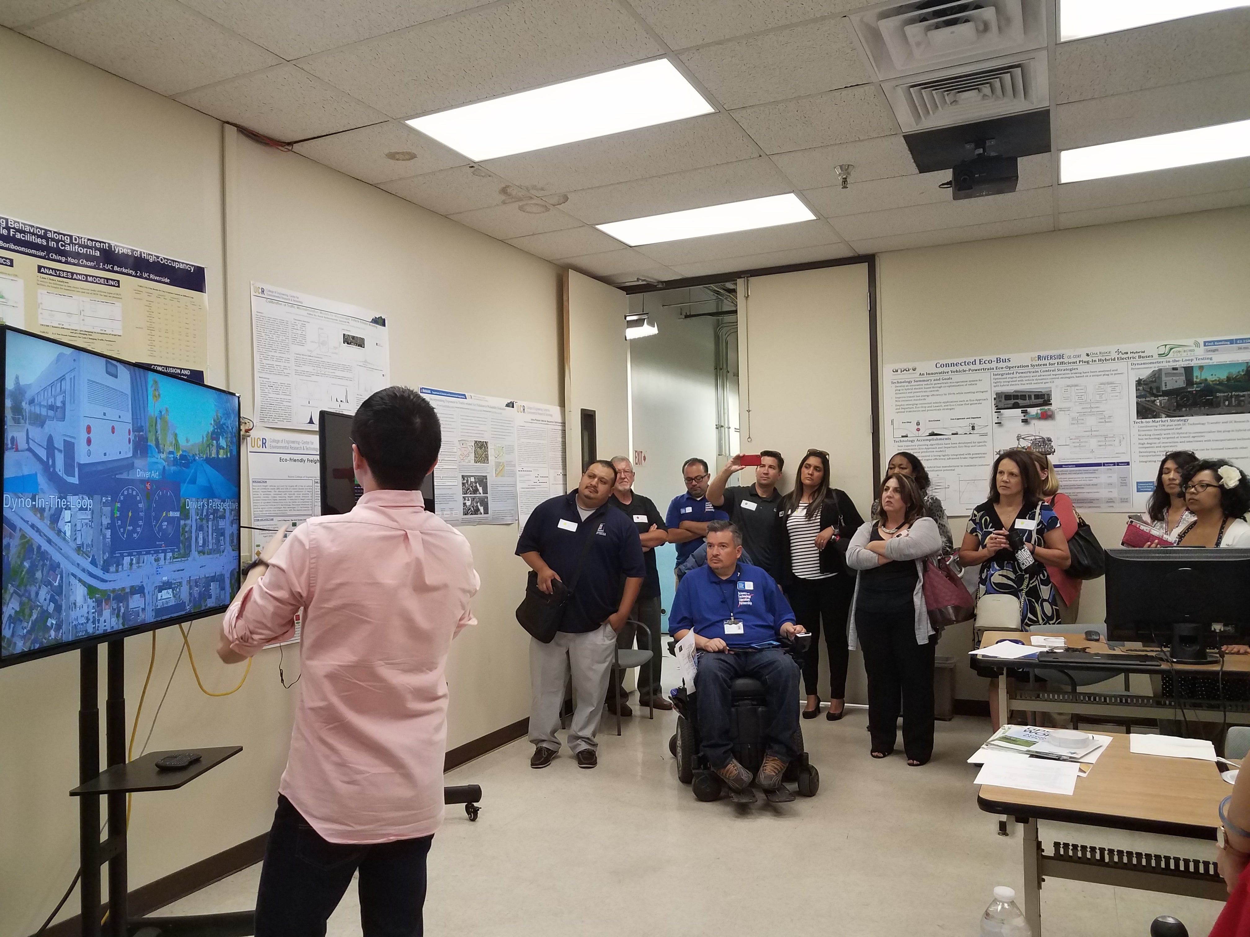 At the second station, Transportation Systems Research graduate students Nigel Williams, Fei Ye, Chao Wang, and Ziran Wang led students through a test drive of an eco-driving simulator designed to model heavy-duty trucks driving under various traffic conditions. Students were able to observe output such as the truck’s speed, acceleration and fuel consumption, as well as the simulator-generated energy-saving driving recommendations that were delivered directly to the driver in real time.