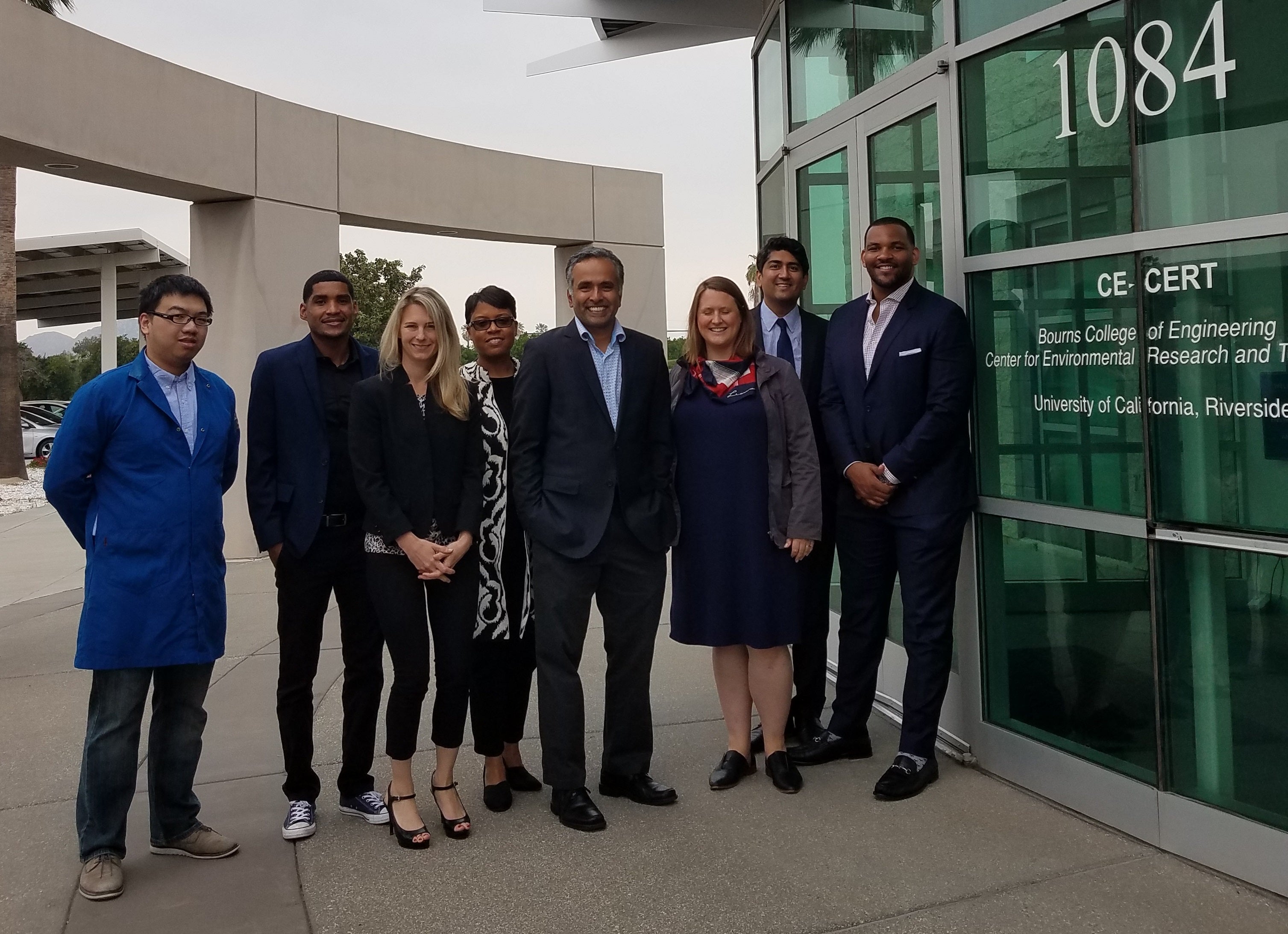 CE-CERT was excited to host the Deputy Treasurer of Housing & Economic Development for the State of California, Mr. Jovan Agee. CE-CERT Deputy Director Nicole Cleary and UC Riverside Professor of Political Science and Public Policy Dr. Karthick Ramakrishnan welcomed Mr. Agee to the Center on May 9th, 2019 to discuss investment opportunities in clean technology. The conversation also included key influencers in the areas of economic and workforce development, healthcare, public safety, climate change, and education: Leigh Hanson, Director of Strategic Partnerships for FUSE Corps; Dr. Paulette Brown-Hinds, Board Member of the James Irvine Foundation; and Aaron Thomas, Director of Economic Development and Opportunity Zones at Accelerator for America. UCR CE-CERT graduate student Chen Le assisted with the CE-CERT laboratory tour and research discussion portion of the visit.