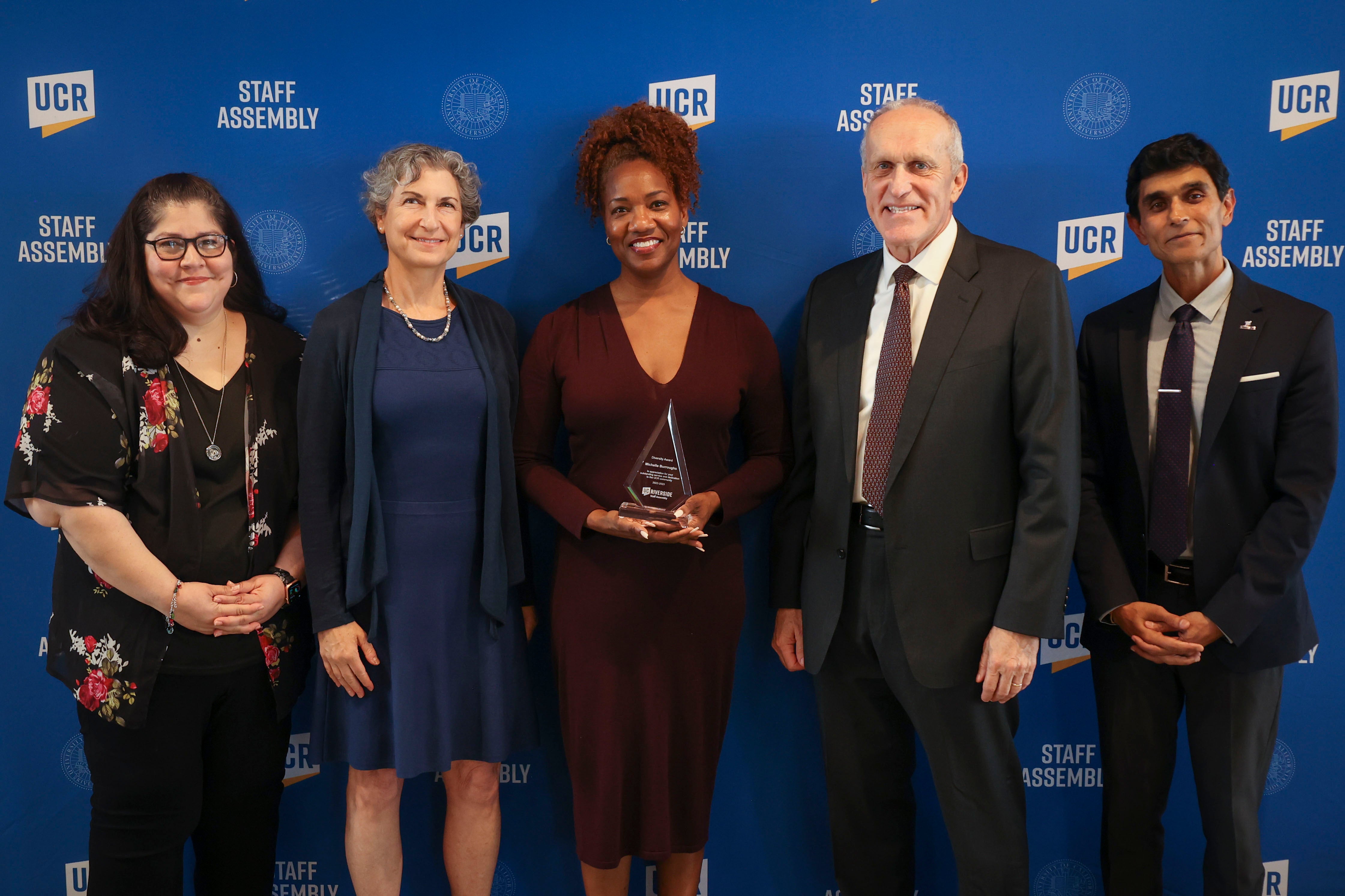 Michelle Burroughs, center, with Staff Assembly President Erika Leon and Provost Elizabeth Watkins to the left and Chancellor Kim A. Wilcox and Staff Assembly past President Agam Patel on the right.