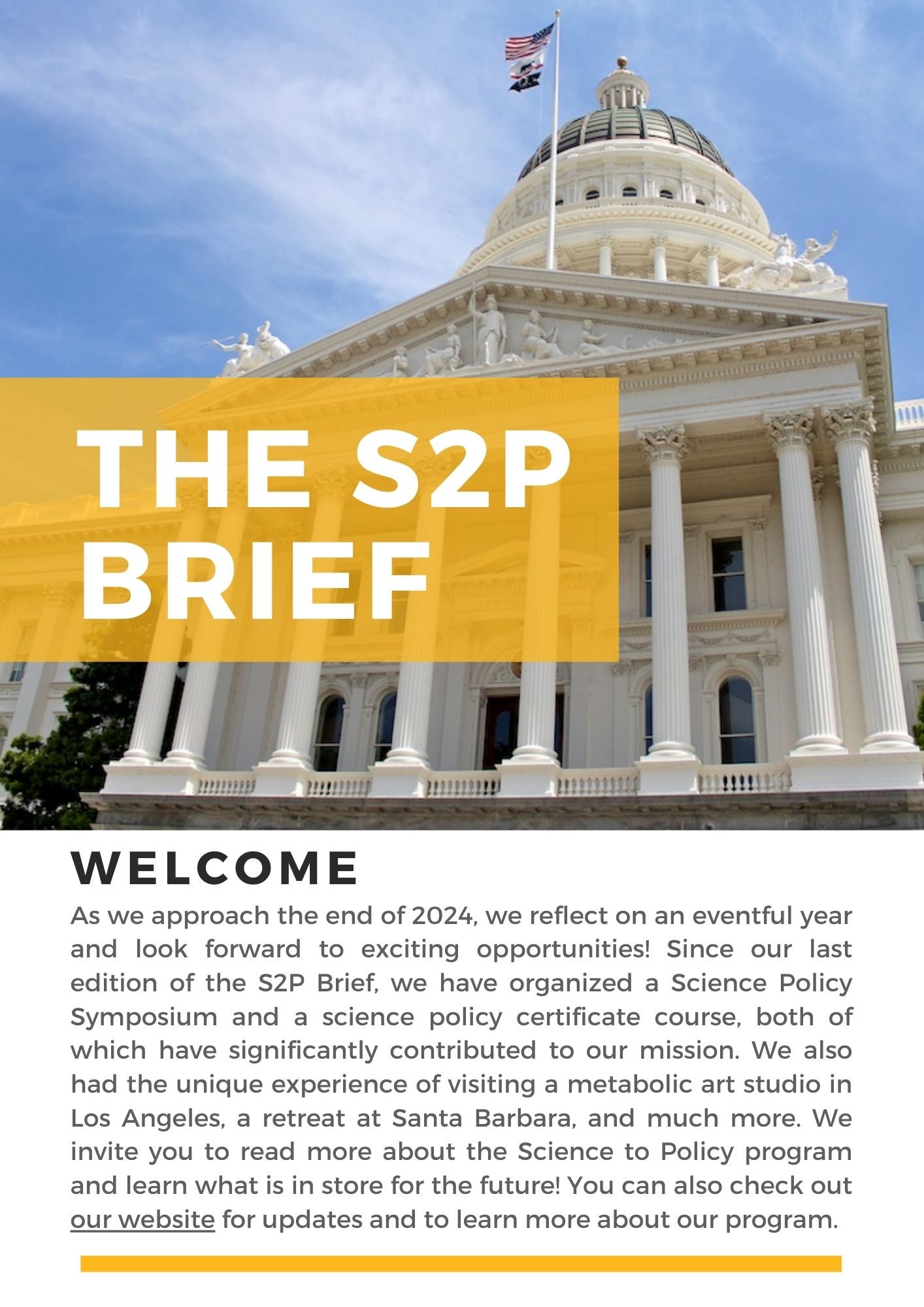 As we approach the end of 2024, we reflect on an eventful year and look forward to exciting opportunities! Since our last edition of the S2P Brief, we have organized a Science Policy Symposium and a science policy certificate course, both of which have significantly contributed to our mission. We also had the unique experience of visiting a metabolic art studio in Los Angeles, a retreat in Santa Barbara, and much more. We invite you to read more about the Science to Policy program and learn what is in store for the future! You can also check out our website for updates and to learn more about our program.