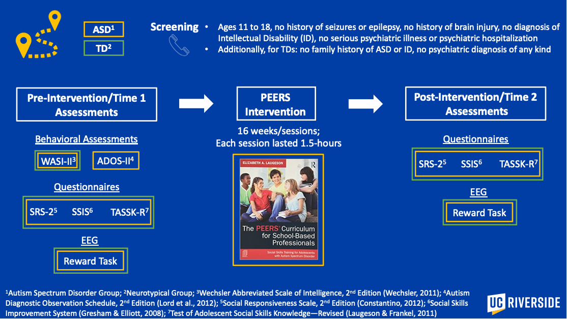 These findings are quite useful! First, they provide objective evidence that participation in PEERS causes measurable changes in brain activity for teens with ASD. Second, our findings show that PEERS might be the most effective for teens with ASD who have the most room to grow in terms of their response to social information. Third, this is one of the first studies to examine neural measures of reward response before and after intervention in a predominantly Latinx ASD sample—a group that is traditionally under-represented in EEG research. Finally, this suggests that the brain’s reward may be somewhat malleable, as our findings indicate teens with ASD who learn social skills get better at interacting with others and may therefore find such interactions more rewarding.