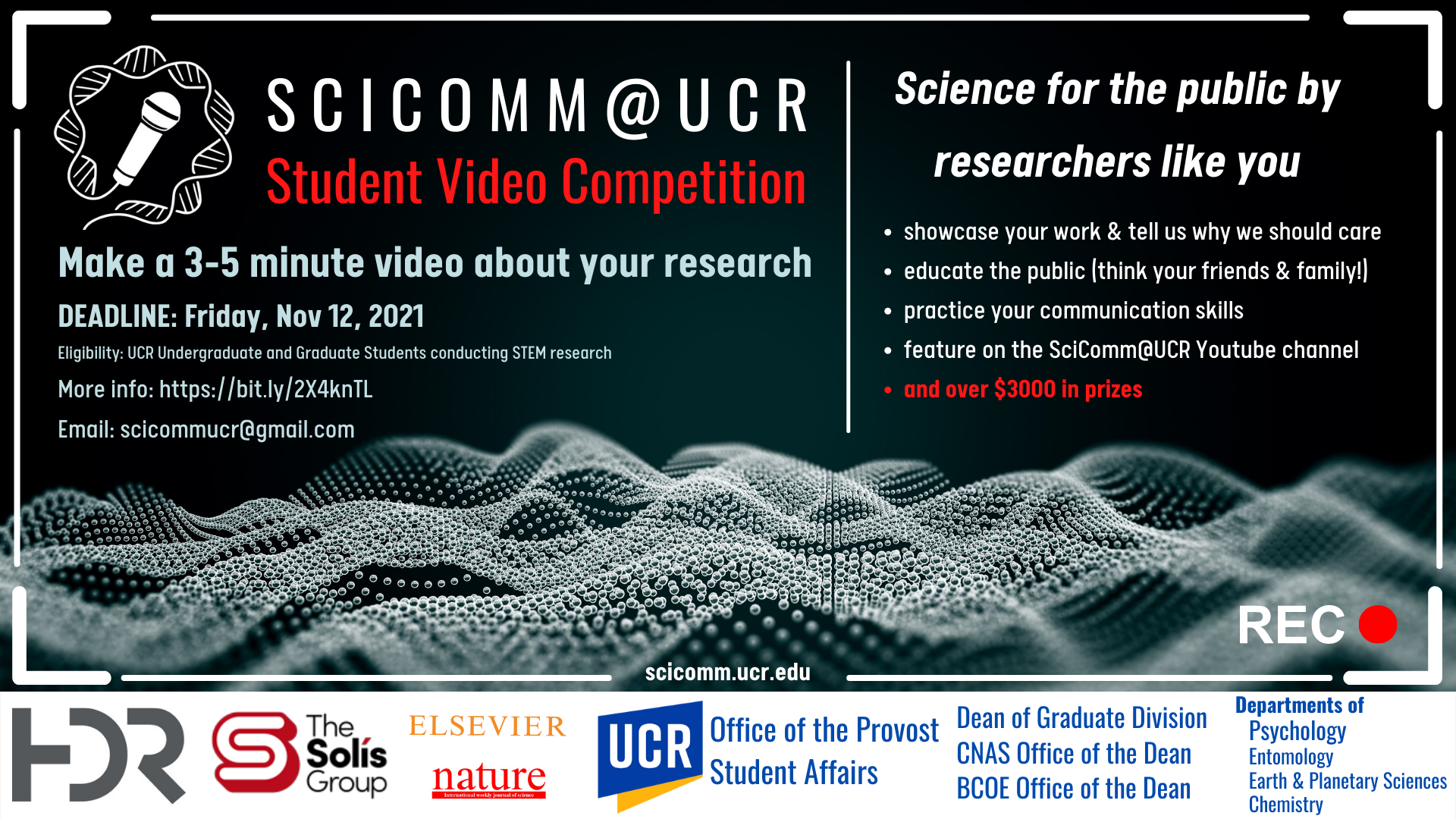 - Submit your unlisted video link to our Google Form by November 12th, 2021. Alternatively, you may email the video file to scicommucr@gmail.com. Please make sure to submit the file named with Department_LastName_FirstName of the individual submitting or the main contact, as appropriate with "Video Competition 2021" in the subject line.