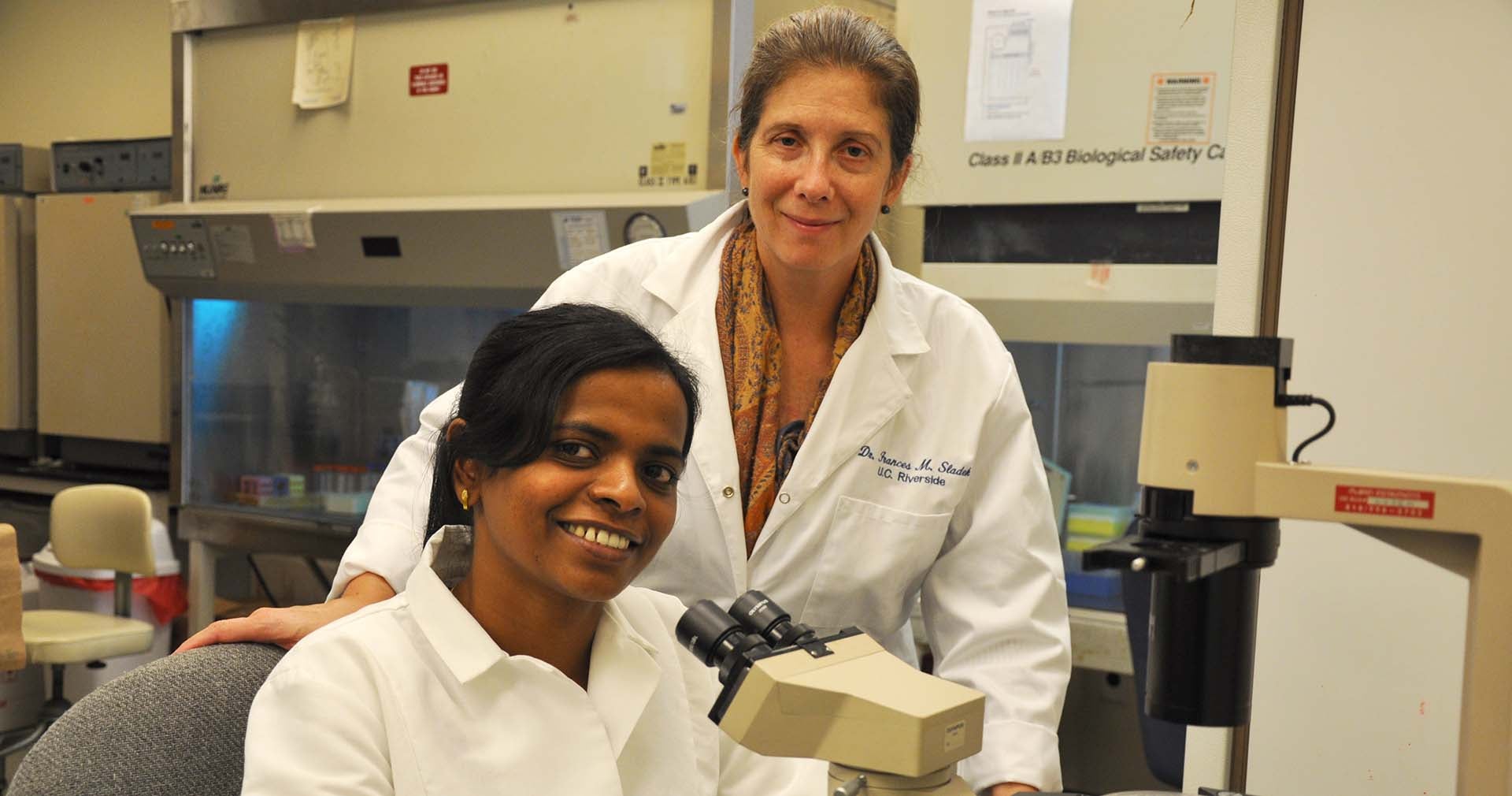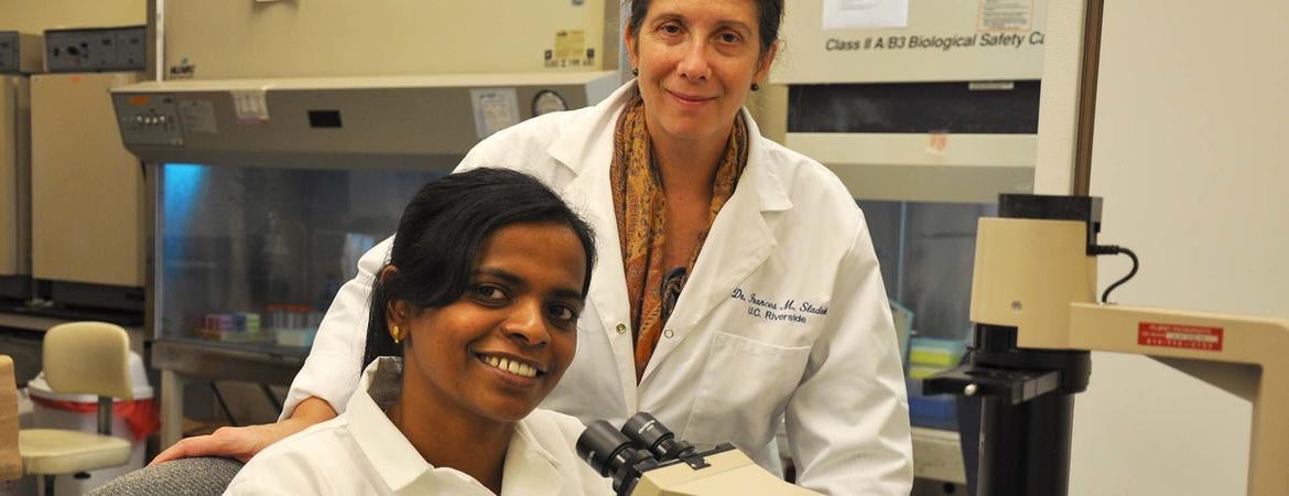 Karthikeyani Chellappa (seated) is a postdoctoral researcher in the lab of Frances Sladek, a professor of cell biology and toxicologist at UC Riverside. Photo credit: UCR Strategic Communications.