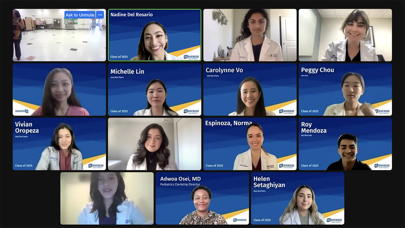 About 200 third and fourth graders from the school participated in the program in the school while the UCR SOM students called in via Zoom. The Highland students received white coats, stethoscopes, and a cardiology book for kids written by Betty Nguyen, MS4. They learned about attending medical school, took the Hippocratic Oath, how to wash their hands and apply sunscreen, and the importance of balanced meals, as well as how to listen to their hearts and be advocates for their health.