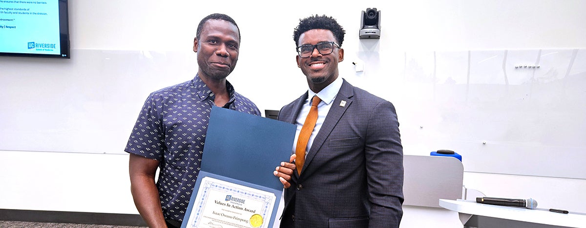 Isaac Owusu-Frimpong, financial administrative officer in the Division of Biomedical Sciences, was named the recipient of the UCR School of Medicine Values in Action Award (VIAA) at the quarterly Town Hall meeting on Tuesday, June 3, 2025.