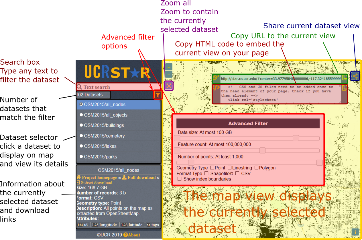 UCR STAR is built to serve the geospatial community and facilitate the finding of public geospatial datasets to use in research and development. The main goal is to allow the researchers worldwide to unleash the true value of the datasets that are available all over the web. To this end, we make all the datasets active by placing them on a map. This helps the researchers in deciding which datasets they can use for their research by exploring them on the map before downloading. The UCR STAR does not own any of these datasets, rather, all datasets are attributed to their original creators and we give them the full credit for sharing these datasets. UCR STAR can serve data publishers by providing the visualization and by increasing the visibility of all these datasets.