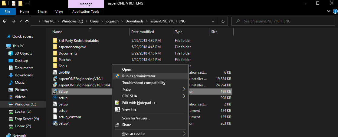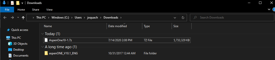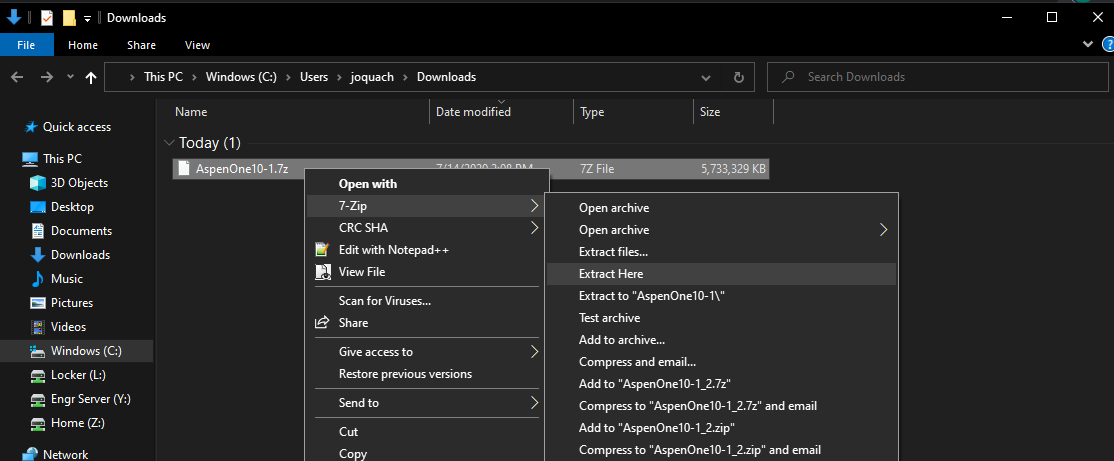 - Navigate to the directory where you downloaded the AspenOne10-1.7z package. Extract the AspenOne folder by right-clicking the package and select “Extract Here.” You will need to use 7zip or a similar utility to extract the file. The file will be in the same directory