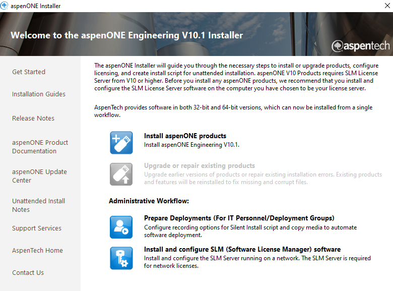 - Select the Button next to “Install aspenOne Products, Install aspenONE Engineering V10.1.”