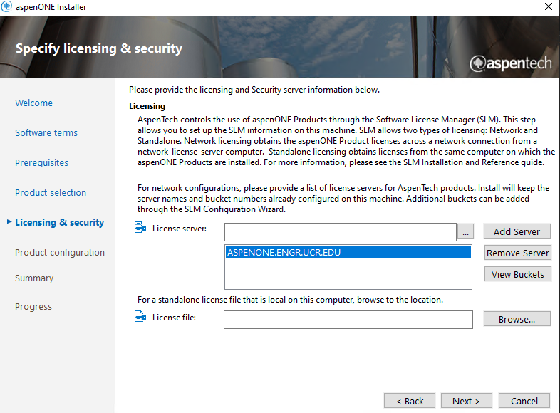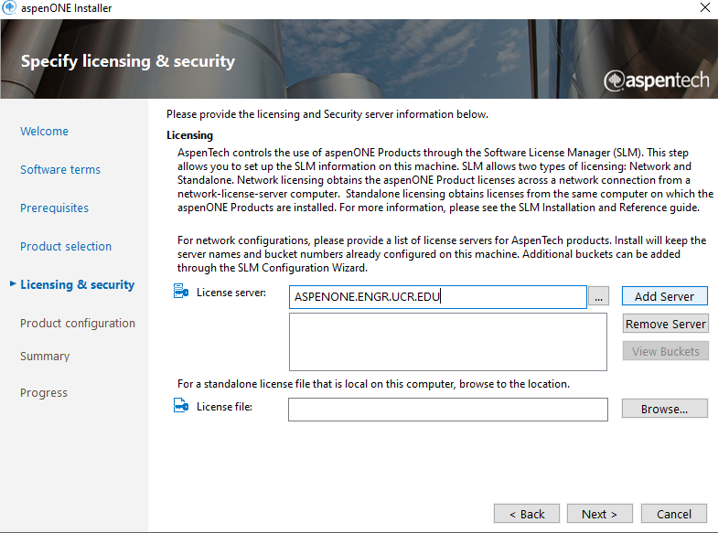 - Enter ASPENONE.ENGR.UCR.EDU as the license server and select “Add Server”. Then select the added server and then click “Next”