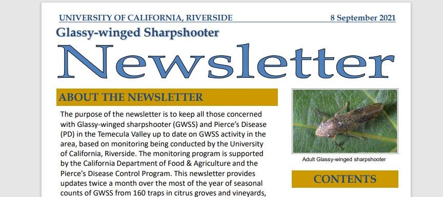 GWSS activity has increased sharply over the last two weeks. A total of 525 GWSS were collected among 131 traps in citrus groves and select vineyards throughout the valley. This level of activity is now well above historic averages for Temecula, but noticeably delayed compared to most years. The delay may be due in part to the relatively moderate temperatures we've had most of the Summer