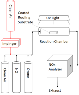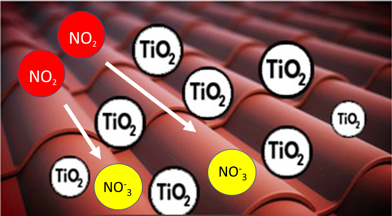 Titanium dioxide treated roof tiles undergo a photocatalytic reaction, oxidizing NOx and converting it into solid nitrates.