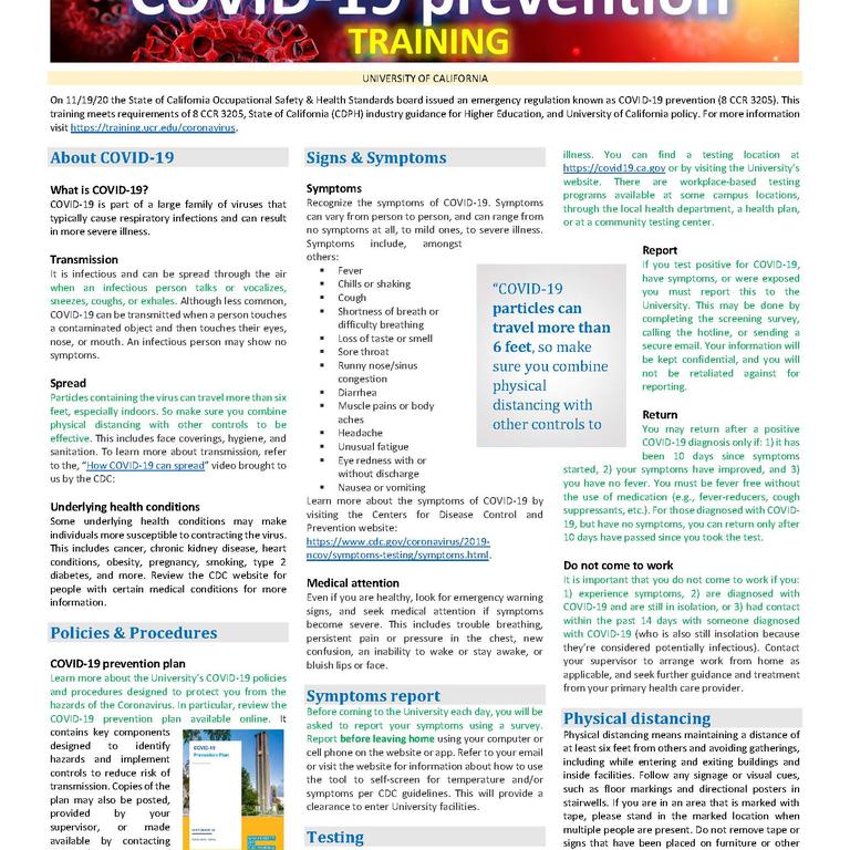 On 11/19/20 the State of California Occupational Safety & Health Standards board issued an emergency regulation known as COVID-19 prevention (8 CCR 3205) which was readopted with changes and new sections added on 06/17/21, 12/16/21, and 04/21/22. This training meets requirements of 8 CCR 3205 and University of California policy.