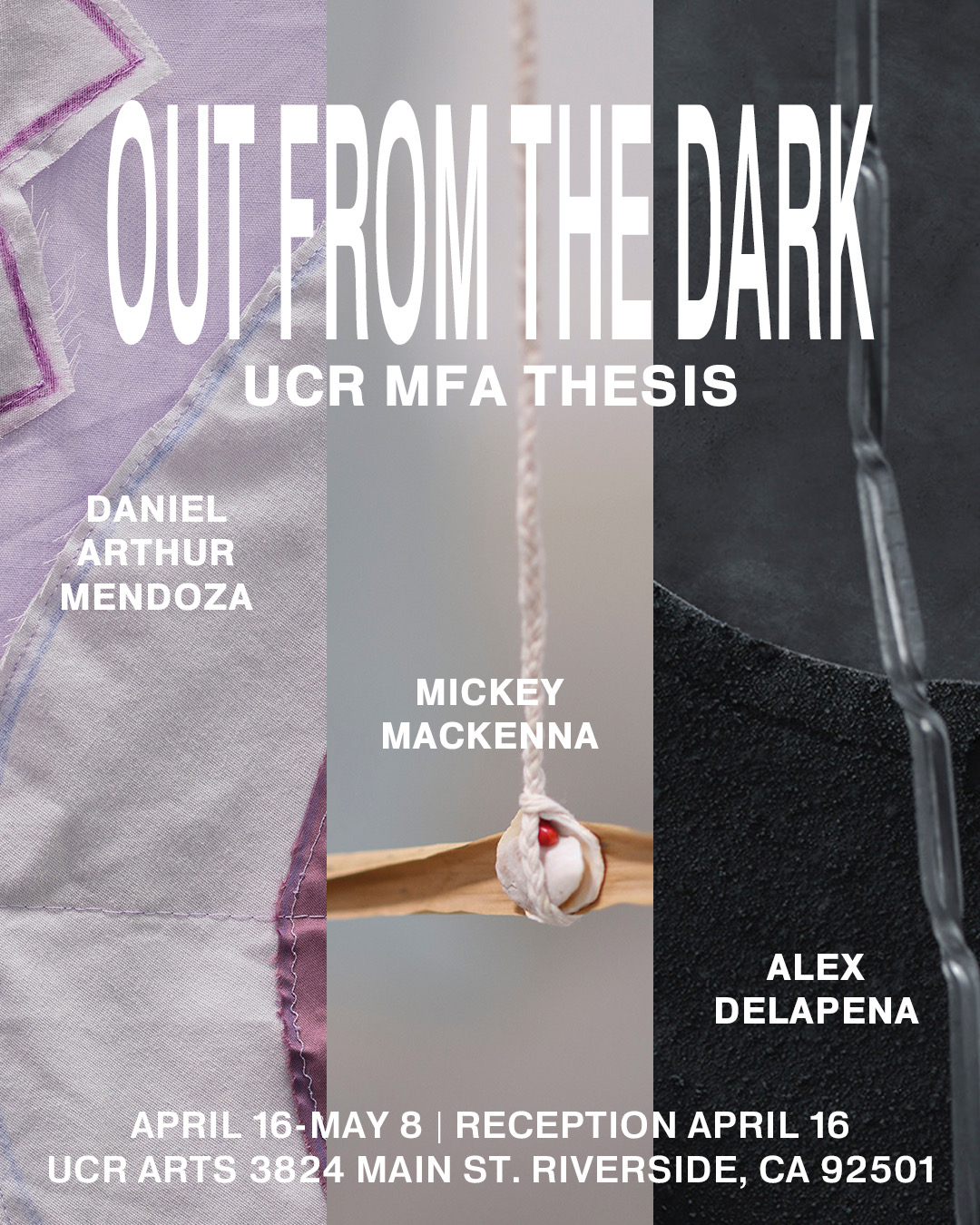 Out from the Dark presents the work of three students graduating from UCR’s Master of Fine Arts program this year: Daniel Arthur Mendoza, Mickey Mackenna, and Alex Delapena. These students join the ranks of MFA graduates from art departments and art schools across Southern California, a region that has become known for transforming its art students into major players on the international art scene. UCR’s distinctive thesis exhibition offers our highly motivated students an off campus, public gallery setting to present an ambitious body of work, cumulating advanced art research and practice into a thesis project. The distinguished full-time faculty in UCR’s Art Department includes Anna Betbeze, John Divola, Jim Isermann, Brandon Lattu, Charles Long, Lynne Marsh, Yunhee Min, and Amir Zaki.