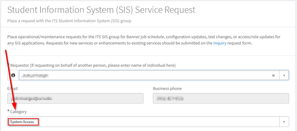 2. Go to Student Information System (SIS) Service Request in ServiceLink If you do not have an active CAS session, you may be prompted to enter your UCR credentials before proceeding. In the Category drop down, choose System Access. |
