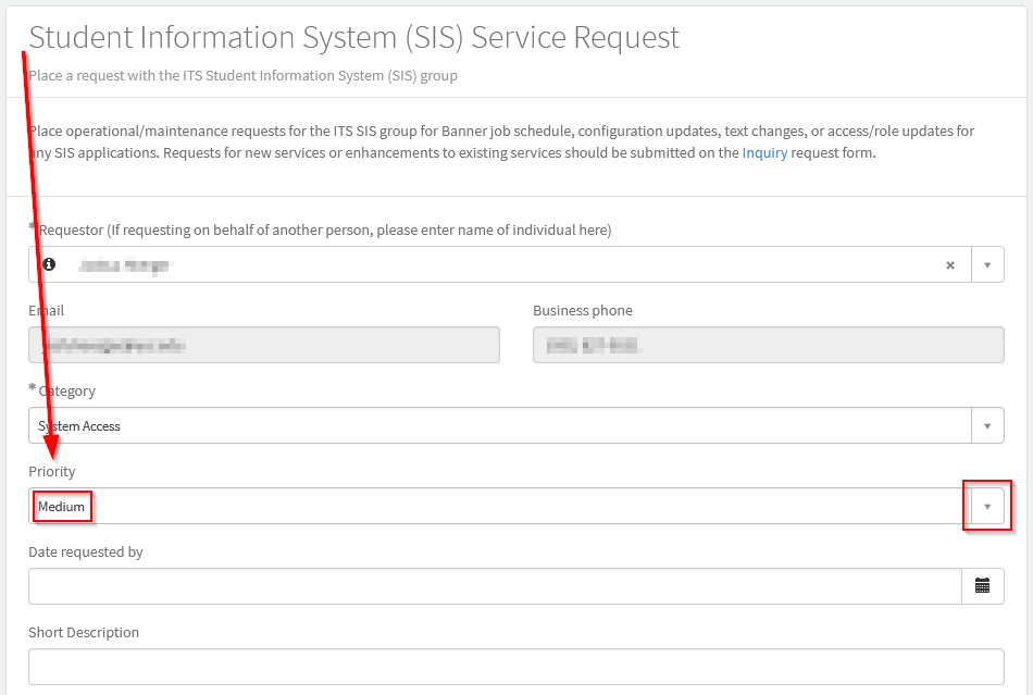 3. Complete the required fields. Enter a brief request description in the Short Description line. Examples include “New Request for Joe Smith” or “Modification to Joe Smith’s access.” |