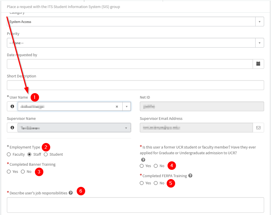 4. Fill out the specific user access requirements. All fields with a red asterisk are required. Enter the following information (numbered on screenshot):