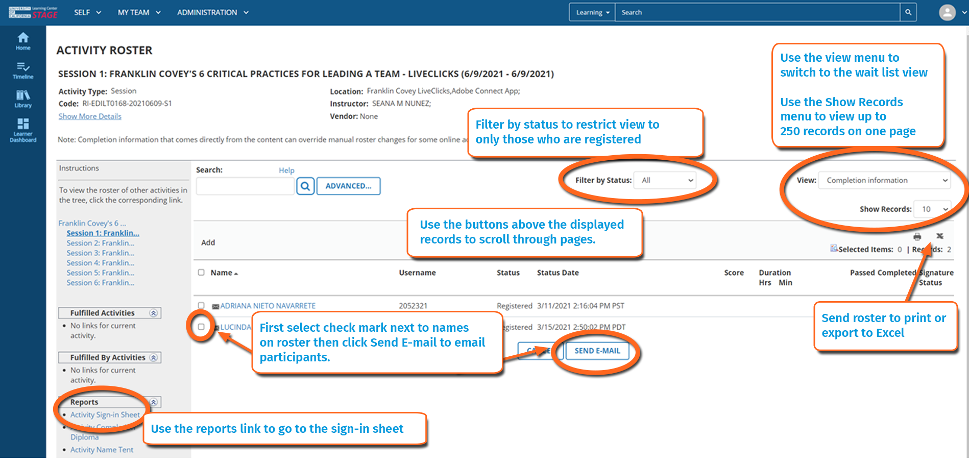 • Review the roster details about the number of people registered, including scores and completion dates