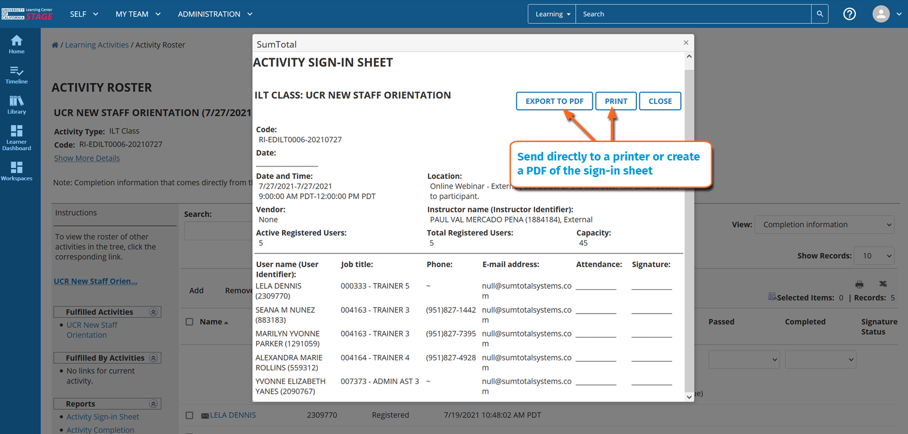 • Instructors must submit completed sign-in sheets for classroom-based activities in order for learner attendance to be reflected in the UC Learning Center. We recommend rosters be submitted as soon as possible after the activity has ended. If a roster is not received within five years of the class end date, any outstanding registrations may be canceled.