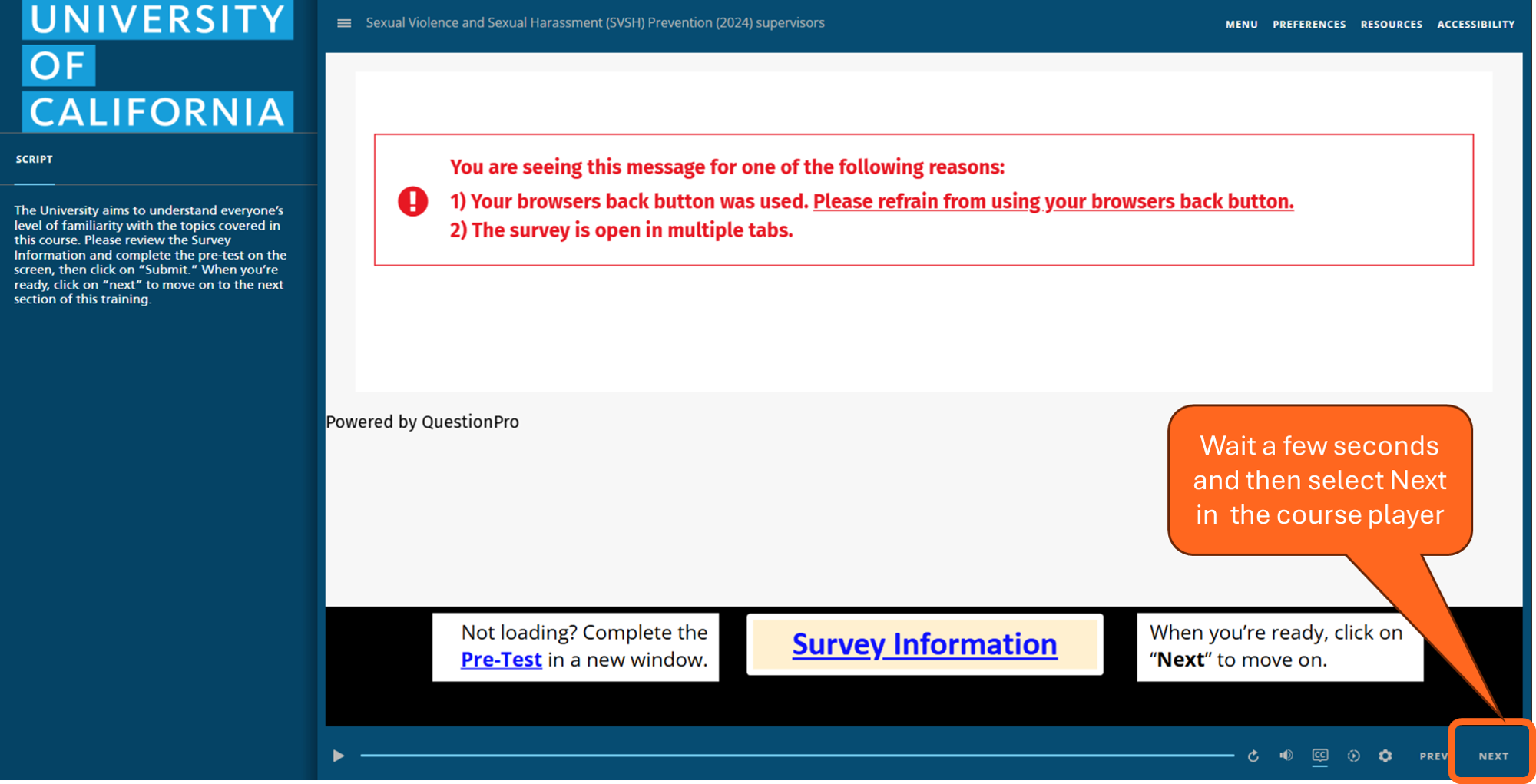 If you receive an error message when completing one of the embedded surveys or tests in the UC Sexual Violence and Harassment, Anti-Discrimination, Prevention and Education (SHAPE) Trainings, try waiting a few seconds and then selecting the NEXT button in the course player to advance.