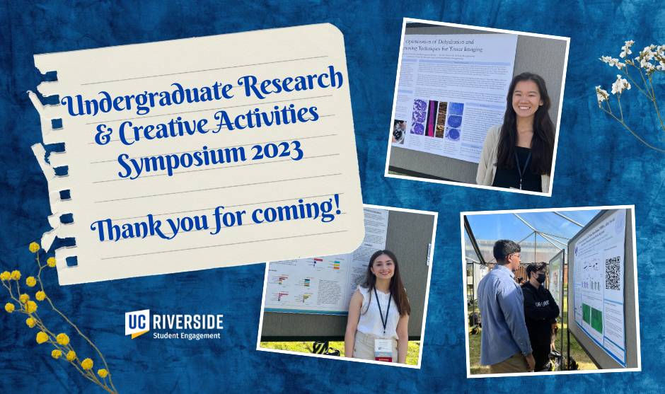 For those who missed the Symposium, we encourage you to visit the website https://engage.ucr.edu/research/symposium to stay updated about upcoming symposiums and how to become a future presenter. Additionally, the recorded presentations from the event will be available on the UC Riverside Student Engagement YouTube channel https://www.youtube.com/@ucrstudentengagement/videos in the coming weeks.