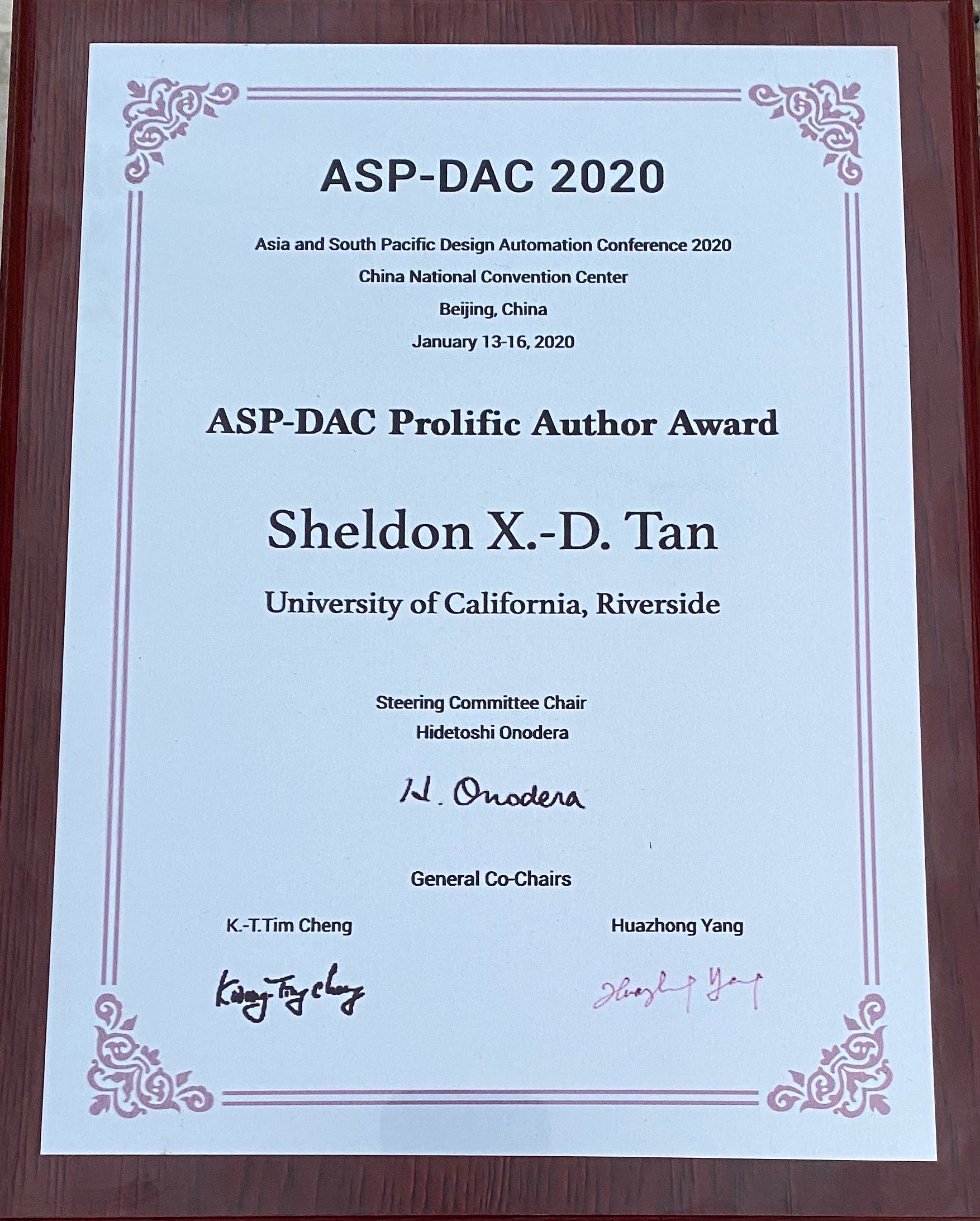 Prof. Sheldon Tan won the ASPDAC Prolific Author Award in the IEEE/ACM Asia and South Pacific Design Automation Conference (ASPDAC) 2020 in Beijing. This award is for authors who have published more 25 papers in ASPDAC. Prof. Tan published 37 papers since 1999, which ranked him as #6 in the prolific author list at http://aspdac-hall.nics.cc. This award shows the significant contribution and impacts from Prof. Tan's VSCLAB at UCR on ASPDAC and on electronic design automation technique in general.