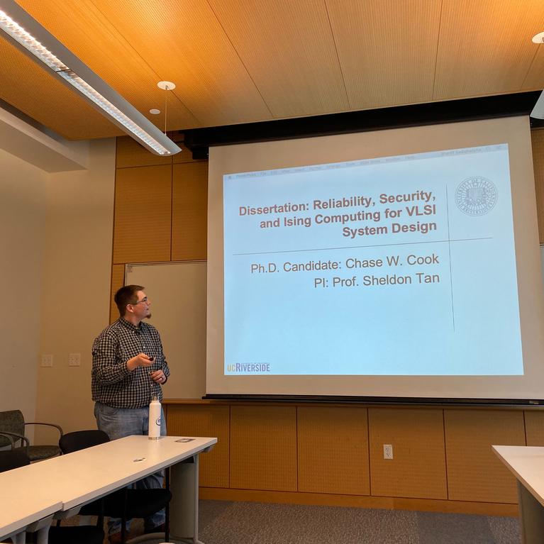 Ph.D. student Chase Cook successfully defended his Ph.D. thesis titled "Simulation for Reliability, Hardware Security, and Ising Computing in VLSI Chip Design". Chase will join Intel Corporation after graduation. Congratulation on his hard works and successful defenses and we wish him the best in his feature endeavor.