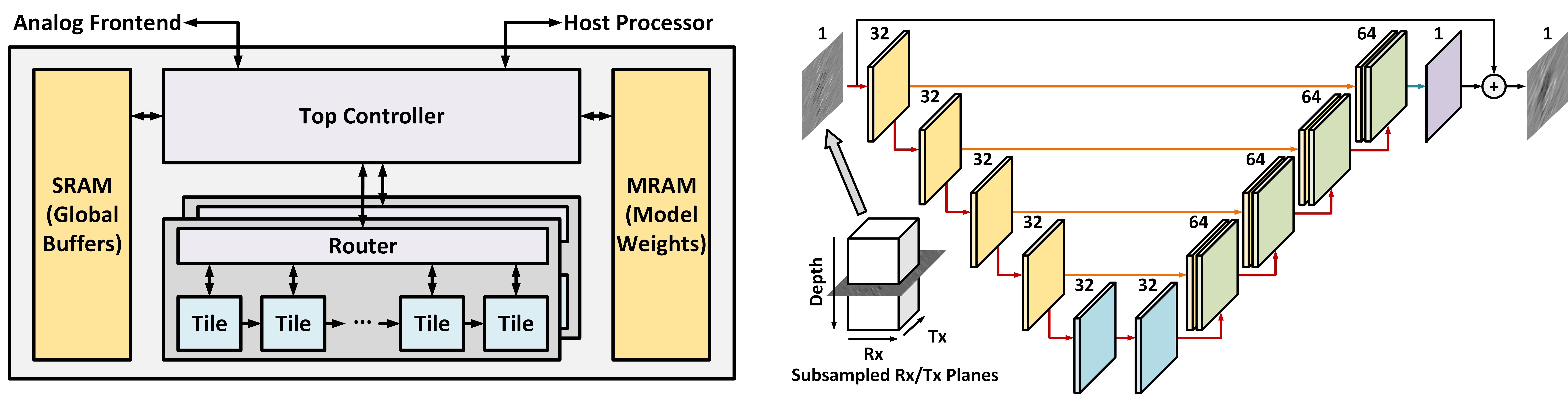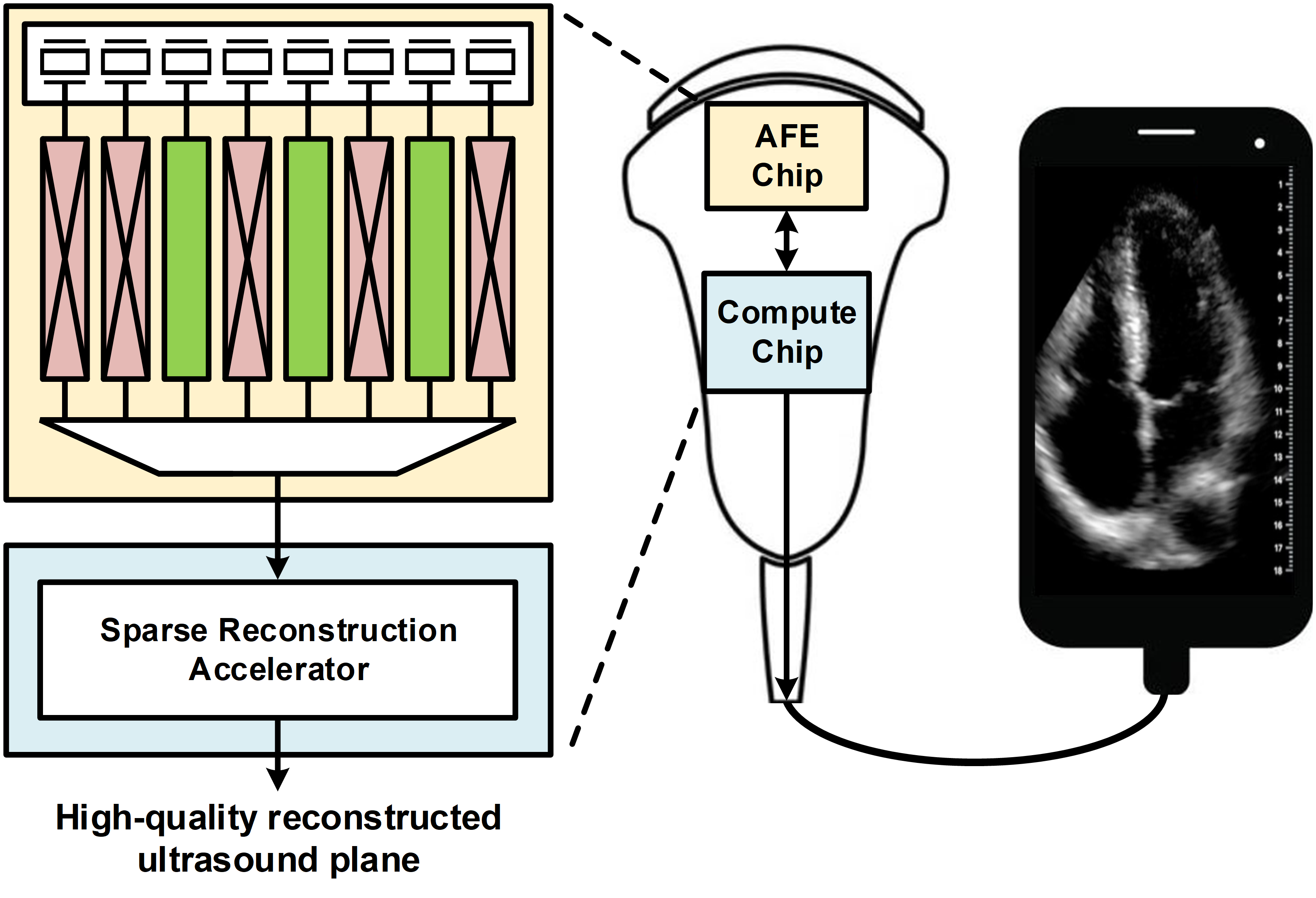 For sparse reconstruction, we design a compact neural network that allows at most 8× channel subsampling and still maintains high reconstruction quality. We also design a digital CIM accelerator to efficiently process the model near the ultrasound frontend. The proposed row-centric inter-layer pipelining addresses the challenge of accelerating U-Net models, significantly reducing the amount of required intermediate storage.