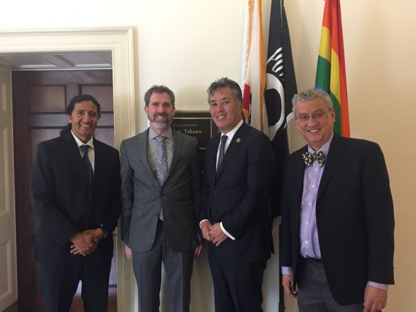 Kenneth N. Barish (second from left), professor and chair of the Department of Physics & Astronomy, visited Washington, D.C., on April 9 for Nuclear Physics DC Day, and met with lawmakers and their staff. Nuclear Physics DC Day is an annual event that gives physicists like Barish an opportunity to advocate for the national importance of nuclear physics research. This year, nearly 100 nuclear physicists from universities and institutions from across the United States participated. Seen in the photo with Barish are, from left to right, Manuel Calderón de la Barca Sánchez, a professor of physics at UC Davis; Rep. Mark Takano (D-Calif.); and Volker Koch, a physicist at Lawrence Berkeley National Laboratory. Barish also met with staff from the offices of Senators Kamala Harris and Dianne Feinstein during his visit, as well as with five program officers at the National Science Foundation. His trip was supported by the UCR Office of Research and Economic Development.