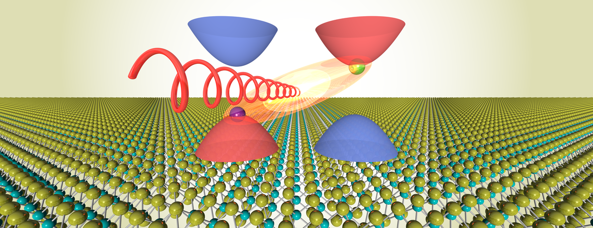 Header image caption: Intervalley exciton light emission from monolayer WSe2. Monolayer WSe2 consists of a two-dimensional array of tungsten atoms (cyan balls) and selenium atoms (yellow balls). Its conduction and valence energy bands exhibit two valleys with opposite electron spins (red and blue cups). An electron (green ball) and a hole (purple ball) in the opposite valleys can be bound to form an intervalley exciton (orange-yellow ellipsoid), which decays to emit light with circular polarization (red spiral). (UCR/Erfu Liu)